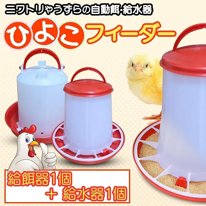 【商品説明】 うずら、ひよこ、にわとりに自動で餌やり・水やりができる、給餌器と給水器です。別名、ひよこフィーダー・チキンフィーダーとも。 エサ入れの受け皿には仕切りがあり、複数の鳥が食べるのに便利な形状を採用。エサが均等になり無駄のないエサやりが可能です。 餌入れ、水入れともにフィーダーのバケツ部分と受け皿は取り外し可能で掃除が簡単。常に清潔な状態で使用できます。保管時は重ねることができ、省スペース。 餌やり機は、上部の蓋を取り外し、餌を投入します。給水機は、容器は逆さにひっくり返して水を入れます。エサ、水はフィーダー部から受け皿に自動供給され、溢れることはありません。 鶉、雛、鶏はもちろん、カモやアヒルなど様々な鳥類のエサやり、水やりに使用可能。ウサギなどの小動物にもOK