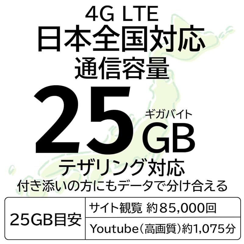 【docomo回線による安定通信】プリペイドSIMの有効期限内であれば、docomo の 4G LTE 高速データ容量25GBまで使えます。利用エリアや速度は安定、テザリング利用も可能です。