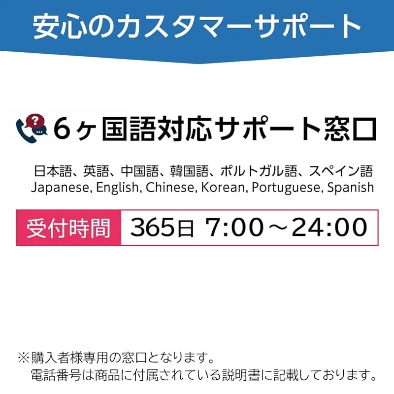 【3ヶ国語対応ヘルプデスク】日本への一時帰国の方や訪日外国人の方に安心な365日対応の日本語、英語、中国語の電話窓口がございます。商品同梱の説明書に電話番号記載あり