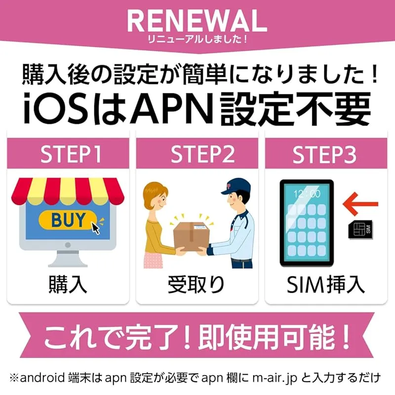【本人確認なし、使い捨てタイプ】クレカや口座などの面倒な手続きなし。届いたその日にAPN設定すればご利用いただけます。日本国内で使用する場合は技適マークが付された端末で使用してください。