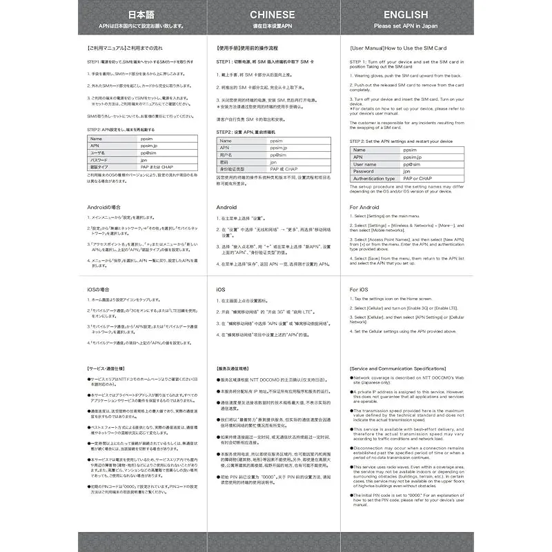 【3G】2,100Mhz 、900Mhz ※ご利用機種によっては利用出来ない場合があります。iosをご利用の場合は他の格安SIMカードの設定が保存されておりますと設定が競合して通信が出来ない場合がございます。 格安SIMのAPNプロファイルを削除する必要がございます。