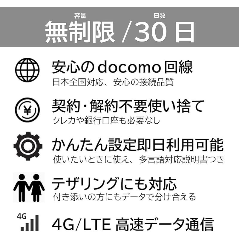 【商品説明】 契約や本人確認なし使い終わったら、捨ててOK データ容量:無制限 1日の容量制限もなし キャリア:Docomo国内回線 対応:スマホやタブレット、ルーターなどのSIMフリー端末 対応サイズ:Nano/Micro/Normal データ通信専用 3ヶ国語対応コールセンター有り 期限:アクティベート後30日間 日本時間を基準として利用開始後30日間※利用日数は日数カウントとなります。 (例え現地時間23時に利用開始した場合、 1時間で1日分としてカウントされますのでご留意ください。)PLU TO GO のSIMです(SIMをデバイスに挿してAPN設定後通信開始します)