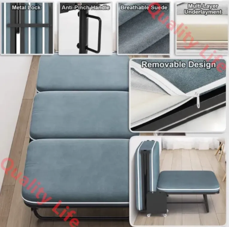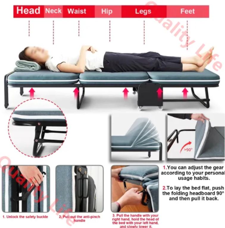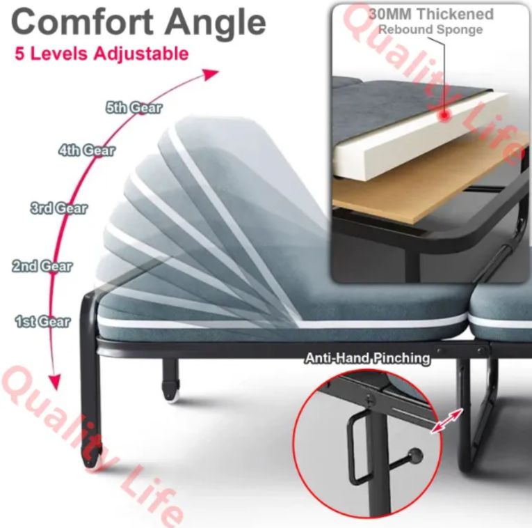 【5段階調節可能】ロールアウェイベッドは5段階調節可能で、休憩するのに適した角度を選ぶことができます。水平状態ではシングルベッドとして使用でき、背もたれを上げればラウンジチェアとしても機能します。折りたたみ式ゲストベッドは、ゲストルームやオフィスで休むのに最適です。 ?
