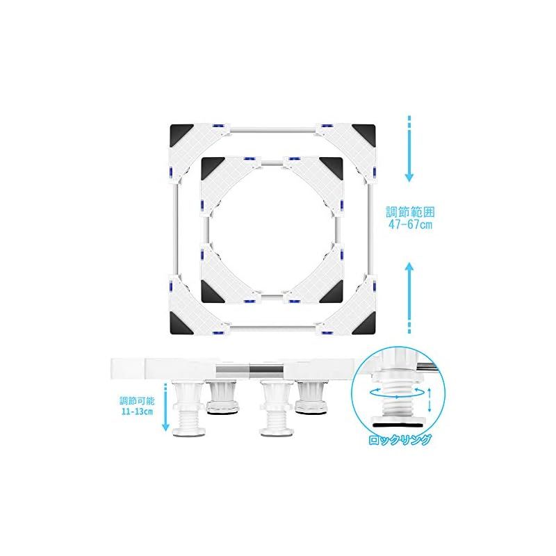 【伸縮可能】洗濯機や冷蔵庫などの大型家具にあわせて幅/奥行き47~67cm、高さ9~11cm まで自由に伸縮可能です。且つ、調節した後、水準測定器を搭載しているパネルで、洗濯機置台の平坦性を確保します。 ★