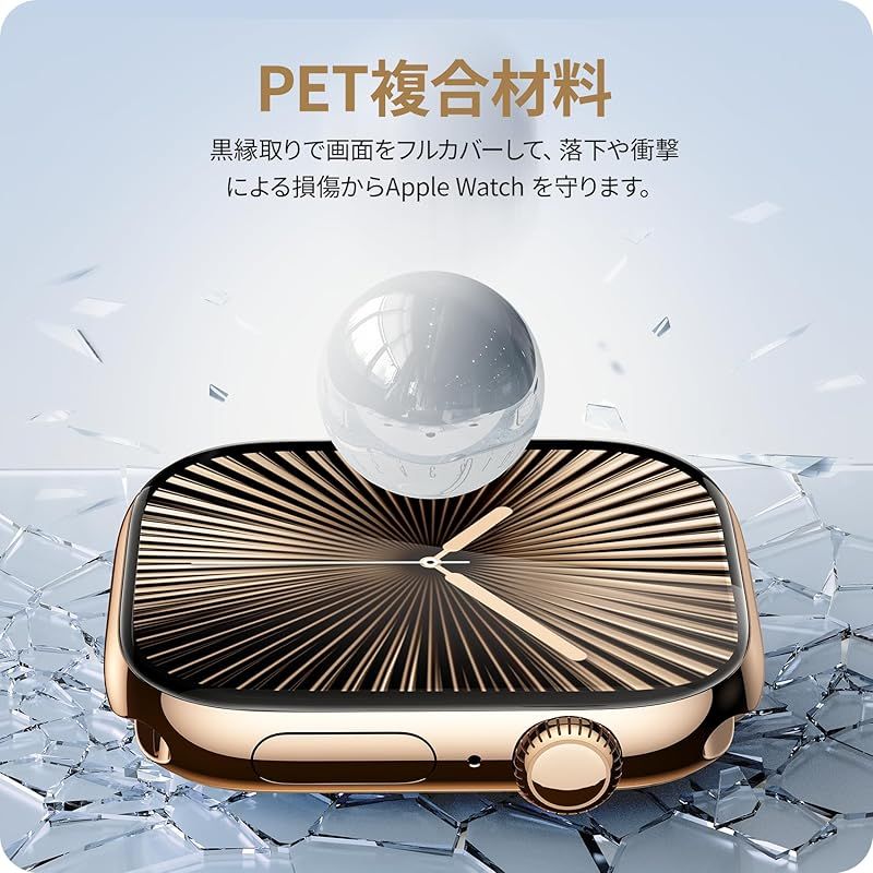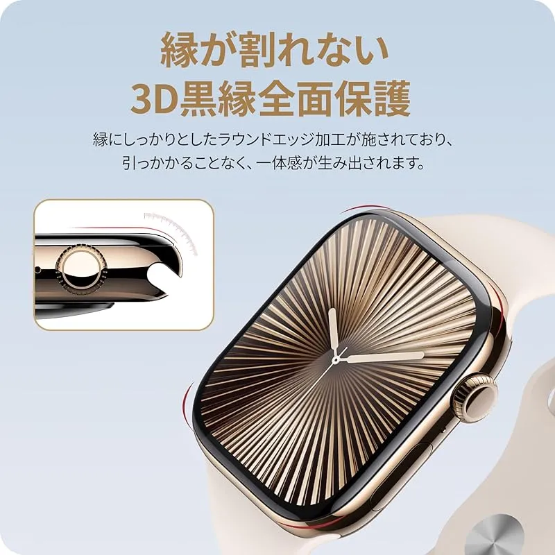 【黒縁全面保護・全新複合材料】新世代のPET複合材料、アップグレードされたカーボンファイバーソフトエッジを採用しており高い柔軟性があります。破損しやすいエッジのトラブルとはおさらば。曲線に沿って黒縁取りされていることでアップルウォッチの画面全体をカバーでき、落下や衝撃による損傷からwatchを守ります。曲線部分も含め全画面を覆うことで、どんな角度から落ちてもフチ割れの心配はありません。 ご注意:全面保護のため、一部のケースと干渉がある場合がありますので、サイズに合わせて慎重にお買い求めください。