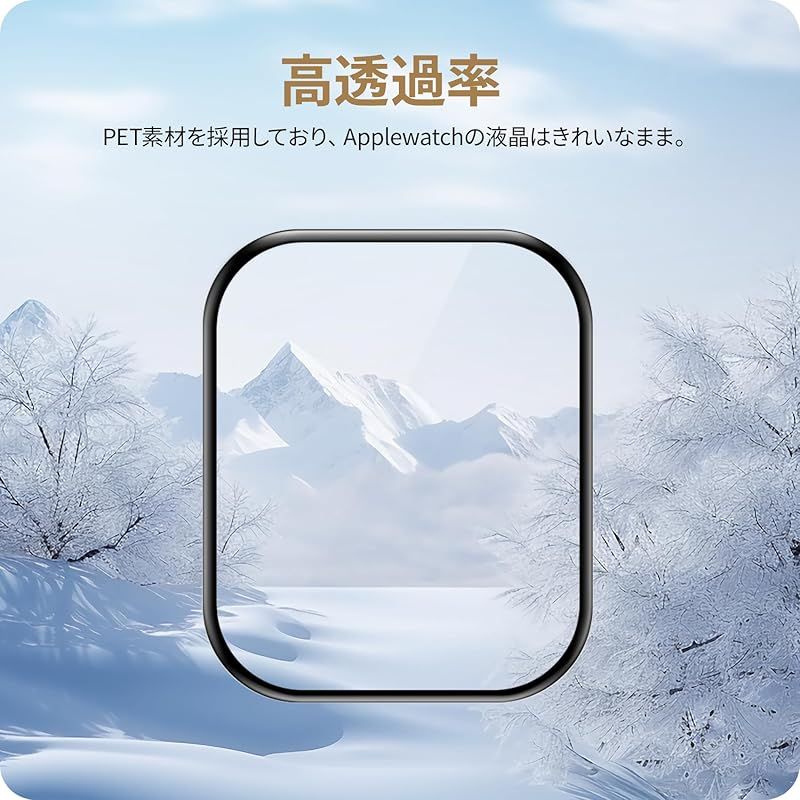 【高透過率&高感度タッチ】高透過率を持つ極薄PET素材のため透明度が高く、Watch画面の精細さを損ないません。また、高品質な素材を採用しているのでフィルムを装着している違和感はなく、タッチ感度も抜群です。3Dラウンドエッジ加工が施されており、サイドからの衝撃に耐える頑丈さを持ちながら、触ったときの引っ掛かり感はなく、快適で滑らかな質感を実現しました。