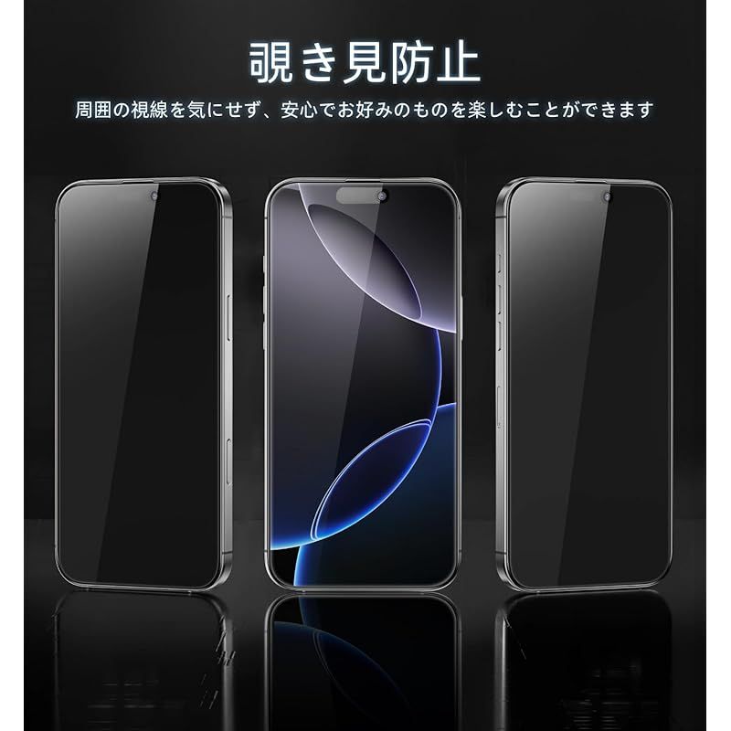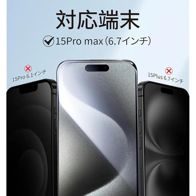 【商品説明】 対応端末:iPhone 15 Pro Max 6.7インチ パッケージ:18.7 x 16.4 x 1.5 cm パッケージ内容:プライバシーフィルム2枚、ウェットティッシュ2個、拭き取りシール2枚、ホコリ取りシール2枚、説明書1本、カード類ツール 機能:ガイド枠付き、貼りやすい、のぞきみ防止、スクラッチ防止、耐衝撃、飛散防止、高感度、タッチ感度良い、気泡レス、9H硬度、ケースと併用できる 規格:9H硬度、飛散防止加工、撥油加工
