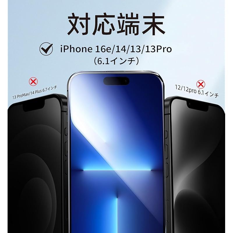 【商品説明】 対応端末:iPhone 13/ 13 Pro/ 14/ 16e 6.1インチ パッケージ:18.7 x 16.4 x 1.5 cm パッケージ内容:プライバシーフィルム2枚、ウェットティッシュ2個、拭き取りシール1枚、ホコリ取りシール2枚、説明書1本、カード類ツール 機能:ガイド枠付き、貼りやすい、のぞきみ防止、スクラッチ防止、耐衝撃、飛散防止、高感度、タッチ感度良い、気泡レス、9H硬度、ケースと併用できる 規格:9H硬度、飛散防止加工、撥油加工