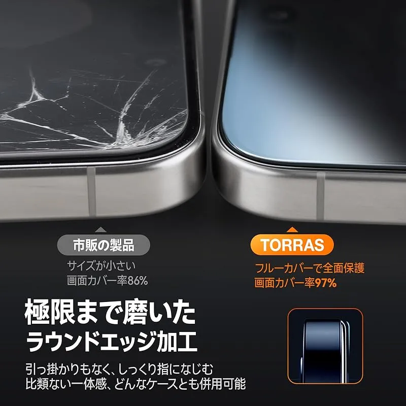 【全面保護・驚くほど頑丈な黒縁】850℃焼き戻し二次強化技術で作られた極細黒縁により、ガラスフィルムのフチ割れを効果的に防ぐことができます。本体端部との隙間を通常の2~3mmから0.6mmにすることで、極細黒縁が画面の表示領域を全く妨げず、全面保護を実現しています。