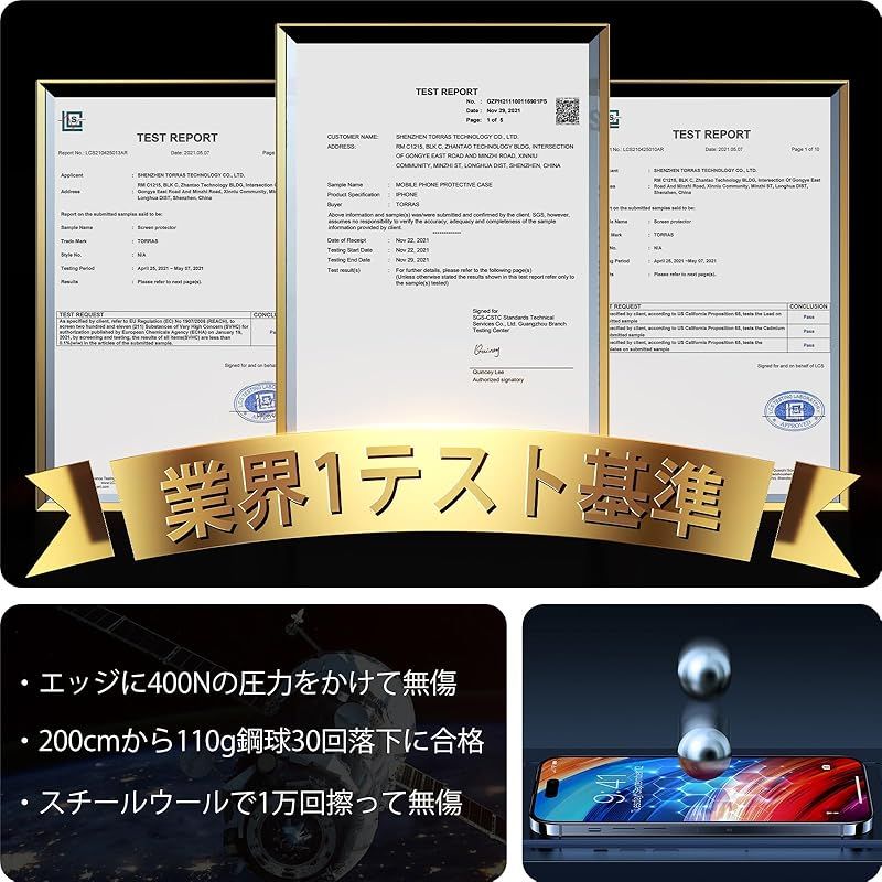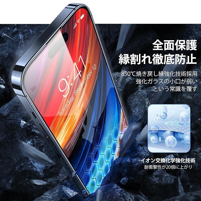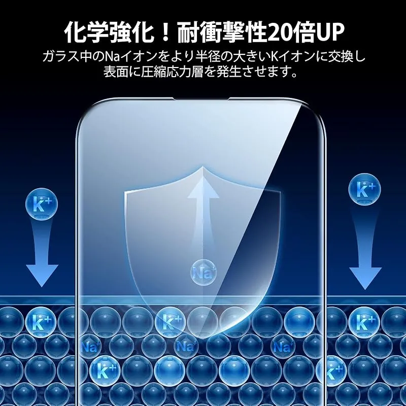 【化学強化・圧倒的な耐衝撃強度】低温型Na+/K+イオン交換法により、ガラスの表面に圧縮応力層を発生させ、キズの発生と伸展をしにくくさせます。背面には新たなSCL緩衝層(Silicone cushion layer)を設け、正面からの衝撃を瞬時に分散させ、iPhone 15・14 Proの画面割れを徹底的に防御できます。
