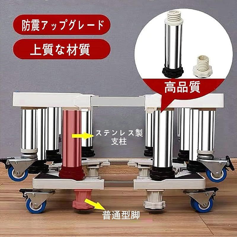 【減音防振】台の四隅にある滑り止めパッド付きます。ジャッキの底部に黒いゴムバンド付きで、滑りを防ぎ、洗濯機自体を安定して、洗濯時と脱水時の騒音、振動が無くなり快適に使用できます。底部の4つのゴム製360°回転キャスターで床を傷めません。移動便利