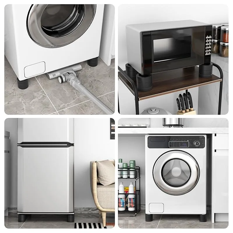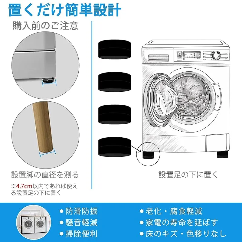 【多用途】家電/家具の脚の直径は4.7CM以内であれば設置可能。ほとんどの家電製品と家具の脚に合っているので、洗濯機、ドラム式、乾燥機、冷蔵庫といった大型家電のほか、机、ベッド、ソファーなども対応可能!適用対象が多い!置くだけ簡単!