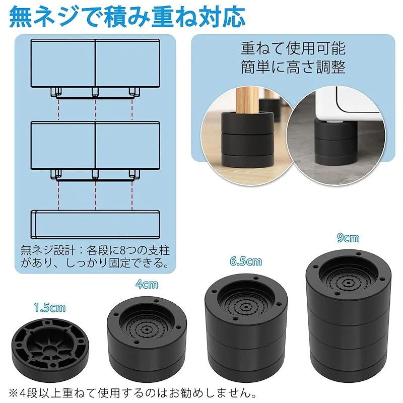 【仕様】色:ブラック 高さ:4CM(2.5+1.5CM) 内径:4.7CM 直径:7CM 12点セット 重ねるだけで使え、簡単に高さを調整できる!3段重ねると9cmの高さができます。耐加重:300KG(4個使用時)