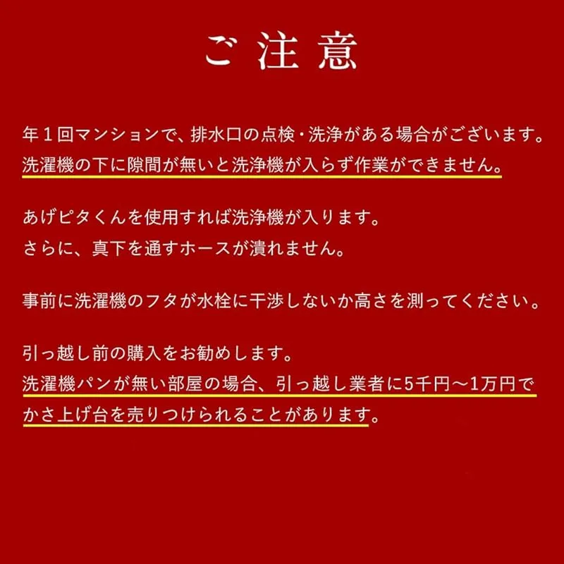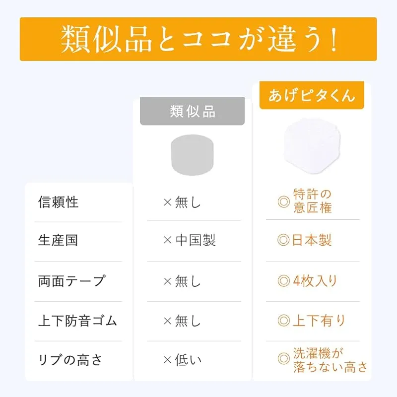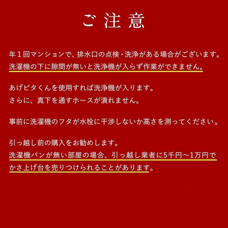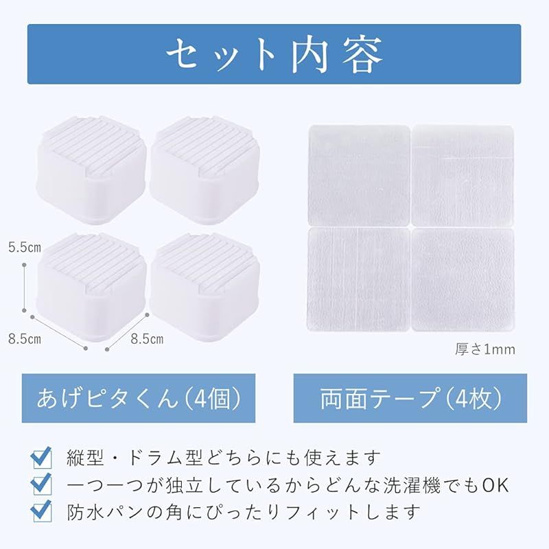 【 セット内容 】 ✅あげピタくん 4個入り (縦8.5cm 横8.5cm 高さ5.5cm) リブの高さ:3mm ✅両面テープ 4枚入り ⭕縦型・ドラム型どちらにも使えます。 ⭕一つ一つが独立しているからどんな洗濯機でもOK。 ⭕防水パン、洗濯機パンの角にぴったりフィットします。 . ✅