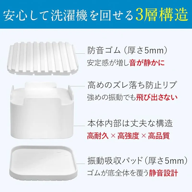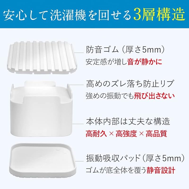【 選ばれる点がこんなに! 】 ✅安心して洗濯機を回せる3層構造 ✅ゴムで底全体を覆い騒音がピタっと静音に ✅滑り止め両面テープ付き:4枚 ✅床にピタっと吸着・振動でズレない ✅女性でも1人で設置可能 ( ※個人差合がありますのでご注意 ) ✅床の隙間をワイパーでササっと掃除できる ✅下に体重計を収納できるちょうどいい高さ ✅洗濯物を取り出しやすく腰が楽に ✅自然な白さで見た目スッキリ . ✅