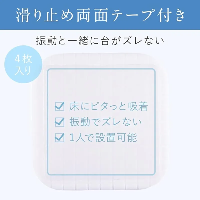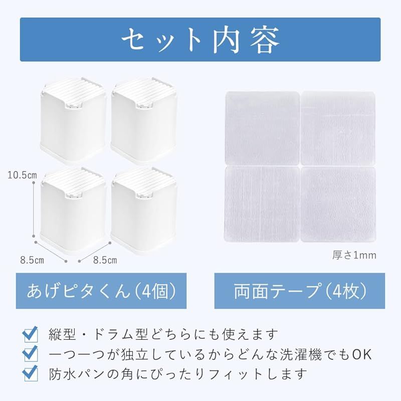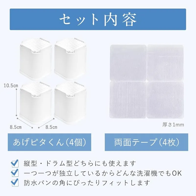 【 セット内容 】 ✅あげピタくん 4個入り (縦8.5cm 横8.5cm 高さ10.5cm) リブの高さ:3mm ✅両面テープ 4枚入り ⭕縦型・ドラム型どちらにも使えます。 ⭕一つ一つが独立しているからどんな洗濯機でもOK。 ⭕防水パン、洗濯機パンの角にぴったりフィットします。 . ✅