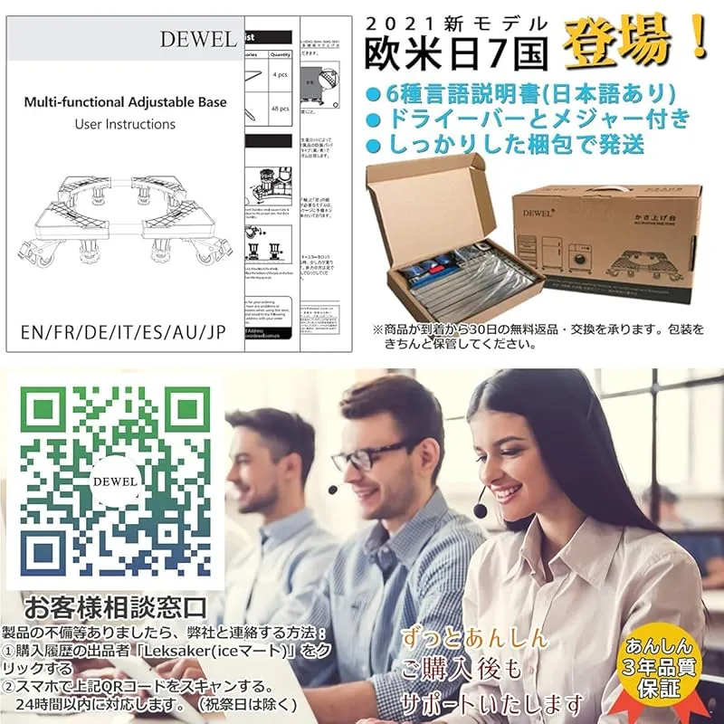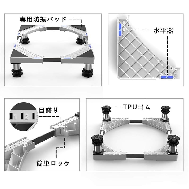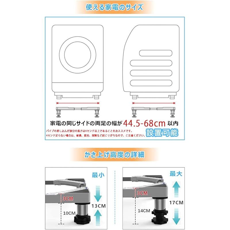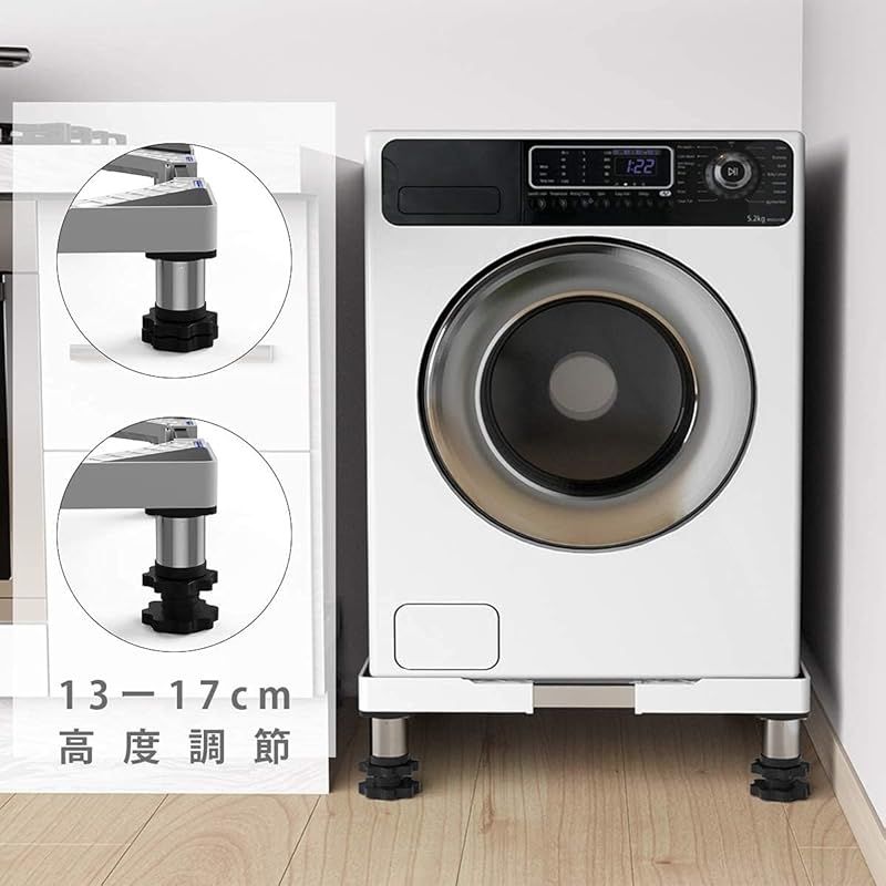 【安定性アップ】:新設計のジャッキ4本が付き、より頑丈なり耐加重もアップ。洗濯機が運作する時動きません。安定感抜群!床から高さを作り、掃除するときに便利です。高さ最大17cmアップなので、家電下の掃除が便利、排水もスムーズです。