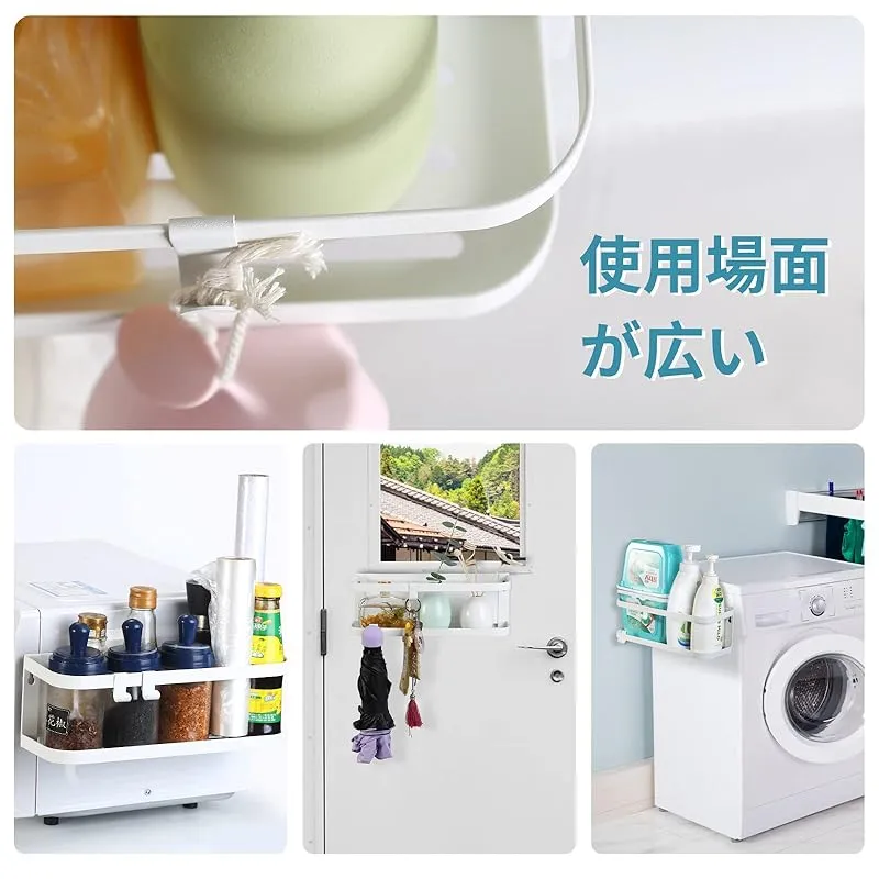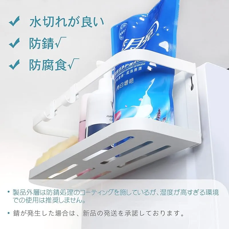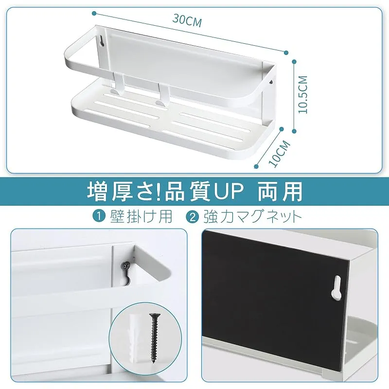 【商品概要】 洗濯機横ラックは強力なマグネットを採用し、接着面が多いで、吸引力がもっと強くなります。最大耐荷重は7kgです。 マグネットラックは使うシーンが多い:洗濯用洗剤を収納するだけでなく、キッチンに調味料などの用品を収納し、冷蔵庫側と電子レンジ側に置くこともできます。鉄製のドアも似合います、フック付きので、香水や鍵など収納することも便利です。 防腐防食:マグネットラックは炭素鋼を採用し、外層は防食コーティングを採用し、サビとカビを防止できます。 二つ取り付け方法:1.マグネットで鉄製の壁を吸引して、工具は不要で、自由に移動することができます。2.壁に穴をあけ、ネジで取り付けます。 製品仕様:サイズ:W30*10*H10.5cm 包装内容:マグネットラック*2本 安心サービス:磁吸が強かない、サビなど品質問題について、お気軽にご連絡ください!交換あるいは返品を対応できます。