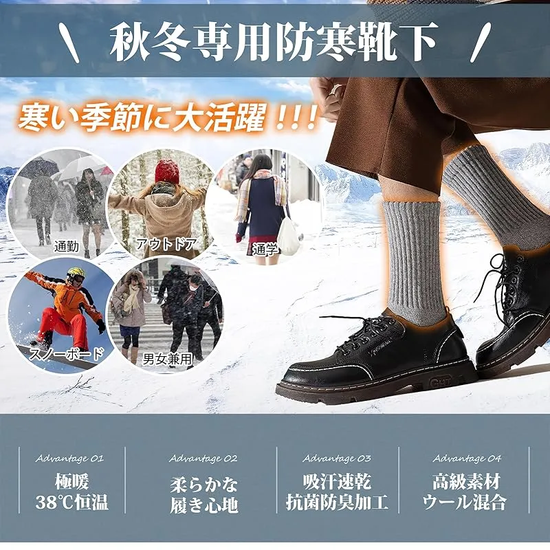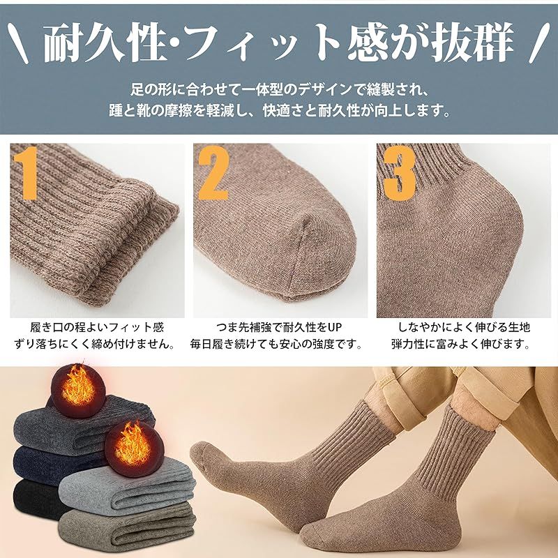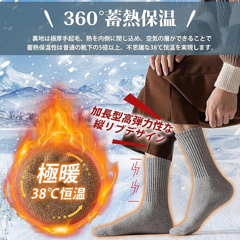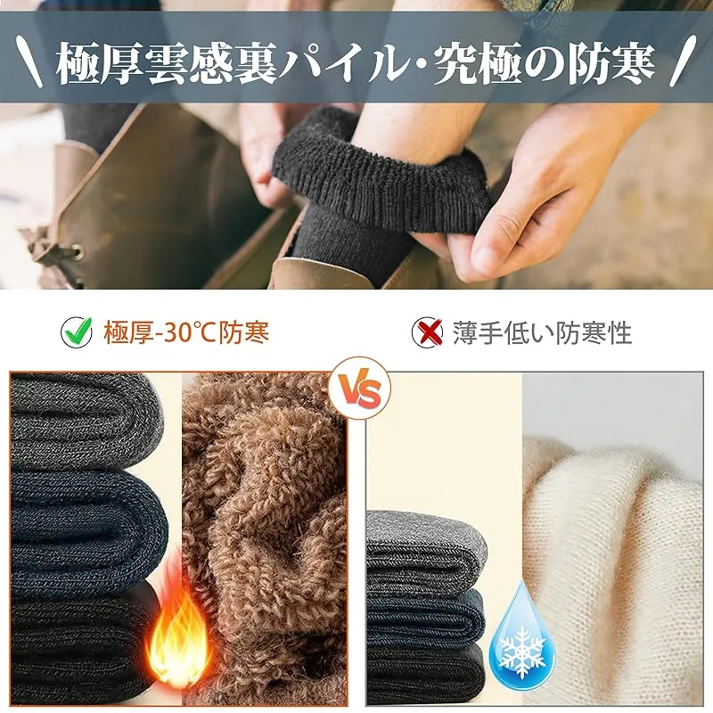 【極厚雲感裏パイル・360°蓄熱保温】靴下は上質なウール素材を採用して、丈夫な材料と丁寧な編み方で足全体フィットし、足にピッタリ、ズレにくいです。裏地は極厚手起毛、熱を内側に閉じ込め、空気の層ができることで蓄熱保温性は普通の靴下の5倍以上、厳冬にアウトドアしても保温性が良い 靴下 メンズ 厚手。履き口からつま先まで全部ふわふわとして、まるで暖かい雲に包まれているような、柔らかな肌触りで足全体をやさしく包み込んでくれるから、同時に足の熱量をしっかりとロックさせて、不思議な38℃恒温を実現します。
