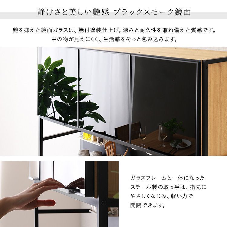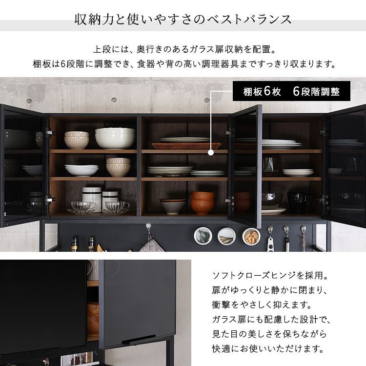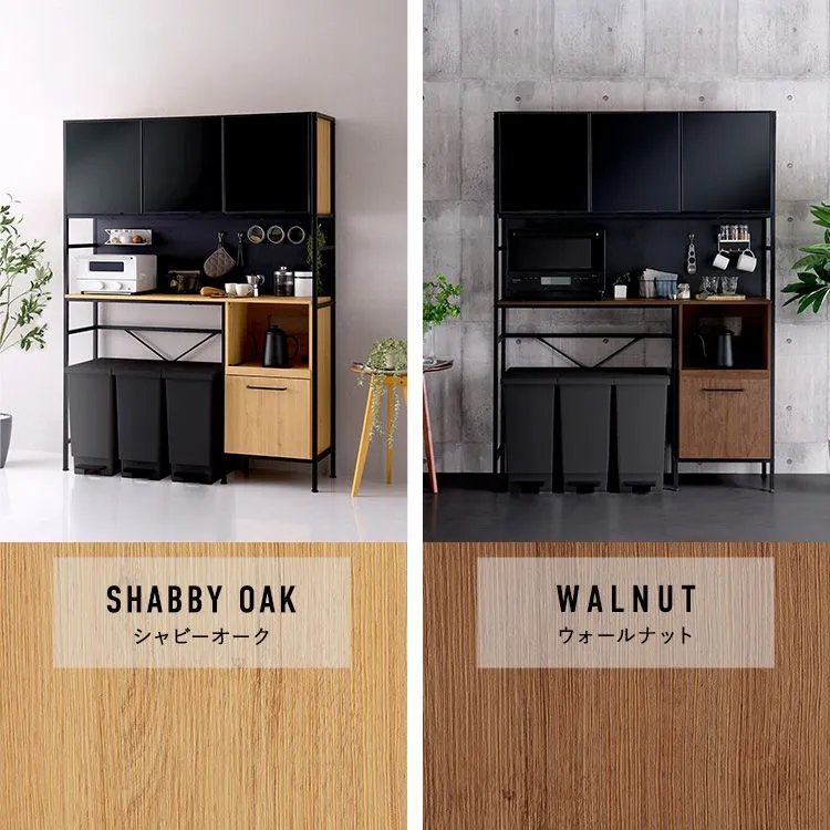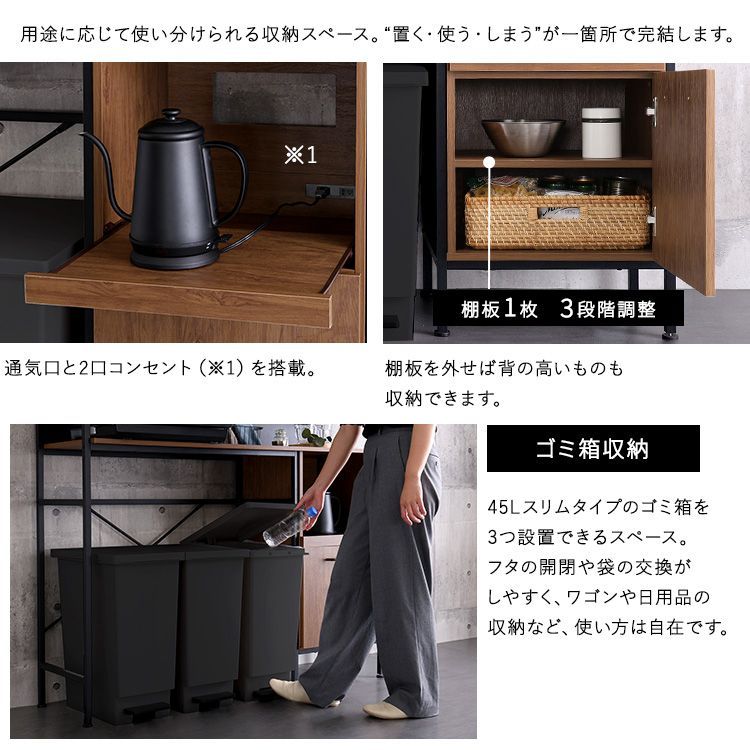 【商品説明】 ヴィンテージなワイドタイプのゴミ箱上ラック食器棚! 上段のガラス扉はブラックのスモークガラスなので高級感があります。 背板はマグネットになっているので、 市販のマグネット収納を取り付けてお好みでカスタマイズできます。 上段の収納扉にはソフトクローズのヒンジを採用しています。 スライド棚には2口コンセントが付いているので、炊飯器やレンジをおいてもOK!