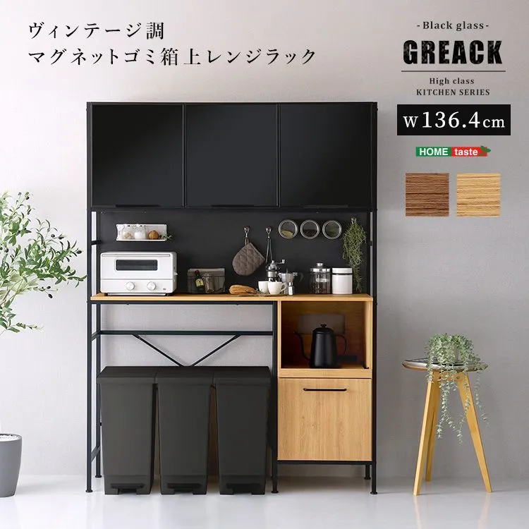 ヴィンテージ調マグネットゴミ箱上レンジラック ブラックガラス【GREACK-グリック-】 MGK-T3WRR-SBO シャビーオーク