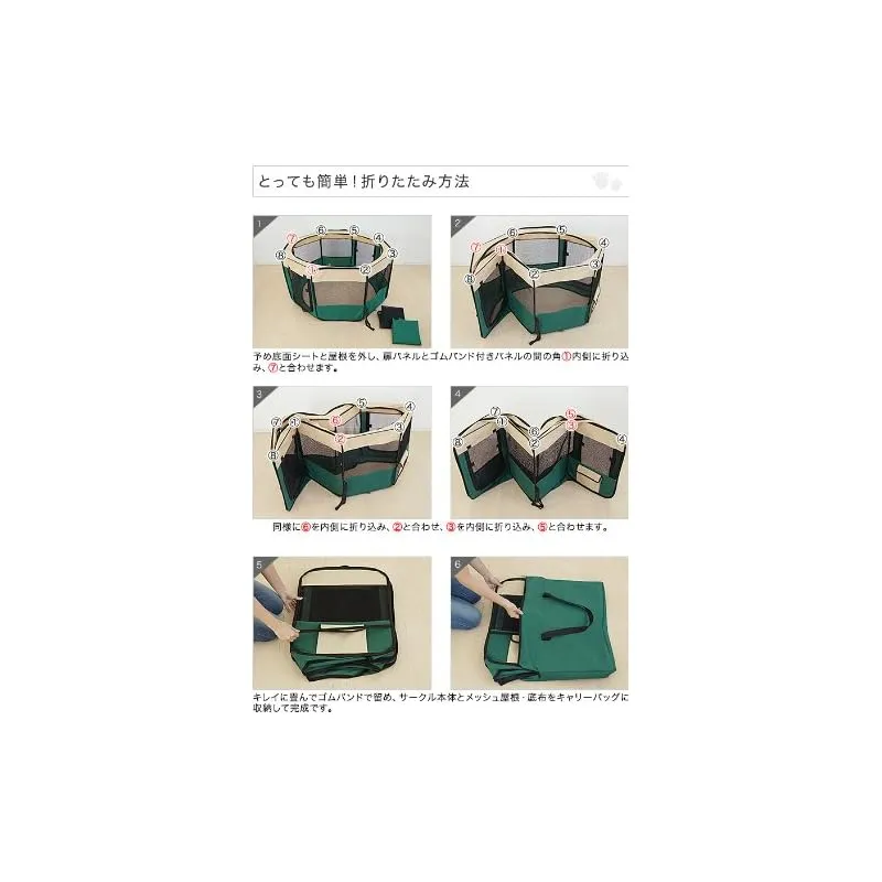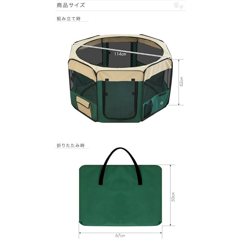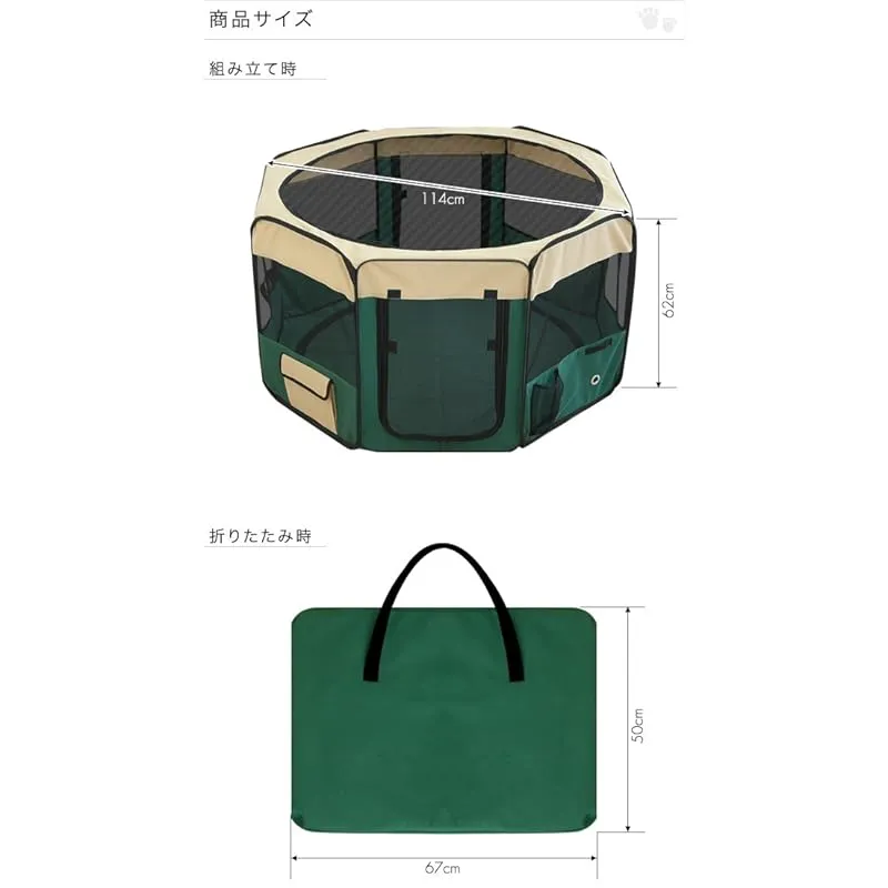 【商品説明】 急な来客時やアウトドアにも最適! 急な来客時やアウトドア時に最適な折りたたみ式のペットサークルです。 側面はメッシュ素材で出来ているので、通気性にも優れています。 折りたたんで専用キャリーバッグに入れると、収納や持ち運びに便利です。 折りたたみペットサークルはこんな時に便利! 女性の方や年配の方も簡単に持ち運び、組み立てができる折りたたみ式のペットサークルなので、 急な来客時用のペットサークルとして、キャンプなどのアウトドア時にオススメなアイテムです。 使わない時は折りたたんで収納! 折りたたみ式のペットサークルなので、収納時も場所をとりません。 専用のキャリーバッグが付いているので、持ち運ぶ時もラクラクです。 商品スペック ・ドリンクフォルダー付き ・小物の収納に便利なサイドポケット付き ・底面シートは取外しが可能(※脱着のファスナーは裏側にあります) ・飛出し防止のメッシュの屋根は脱着可能。ファスナー式なので安心です。 ・アウトドア時には付属のペグ(4本)で固定することも可能です。( ・扉は面ファスナーで固定が可能