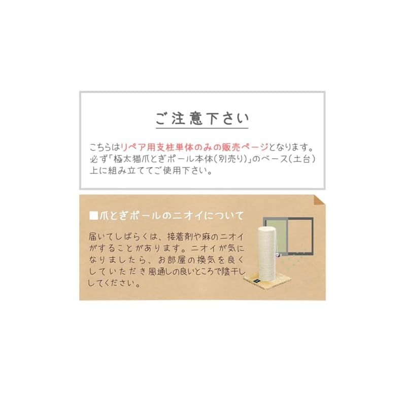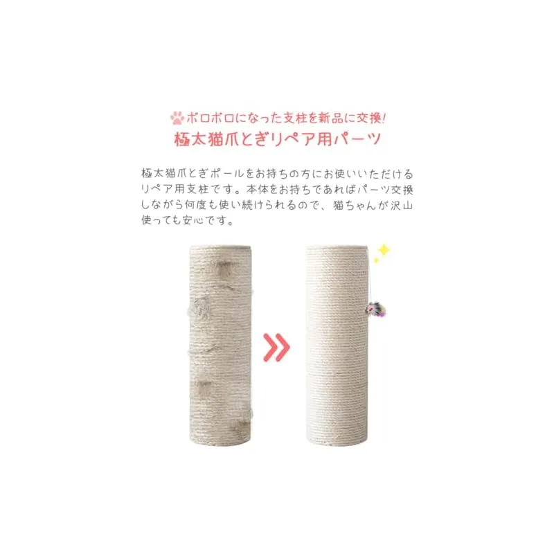 【極太猫爪とぎリペア用パーツ】 極太猫爪とぎポールをお持ちの方にお使いいただける リペア用支柱です。 本体をお持ちであればパーツ交換しながら何度も使い続けられるので、 猫ちゃんが沢山使っても安心です。 ?