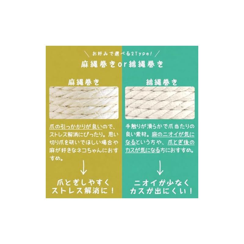 【選べる麻縄or綿縄巻き】 デザインだけでなく、支柱に巻いてある紐の種類も 「麻縄薪」と「綿縄巻」の2種類からお選びいただけます。 それぞれにメリットがあるので、 猫ちゃんや飼い主さんのお好みでお選び下さい。 ?