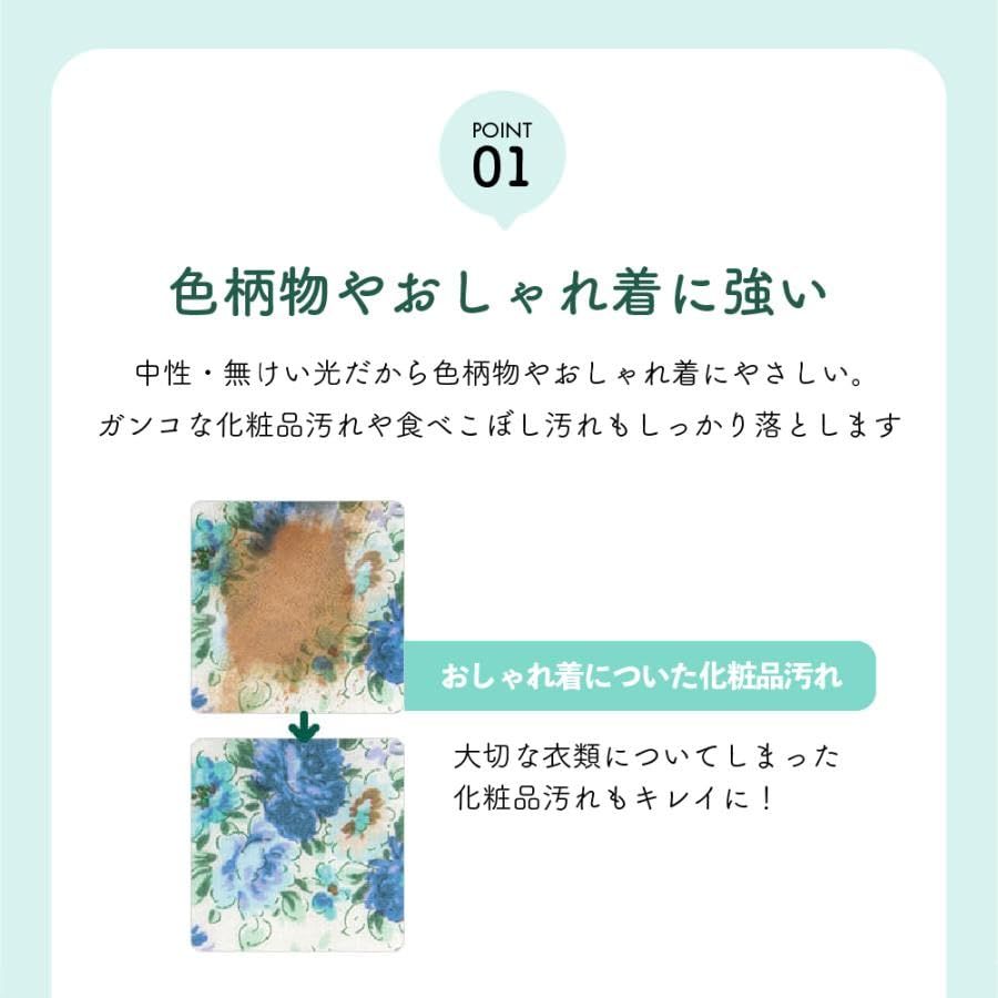 中性洗剤:デリケートな衣類にも安心して使える中性の液体洗剤で、色柄物にも使用可能部分洗い:食べこぼしや皮脂汚れなどの頑固な汚れに効果的な部分洗い専用洗剤安全性:蛍光増白剤を含まない優しい処方で、赤ちゃんの衣類にも安心して使用可能使いやすさ:液体タイプなので、汚れた部分に直接塗布しやすく、すすぎも簡単汚れ落とし:アミノ酸系洗浄成分配合で、衣類を傷めることなく効果的に汚れを除去