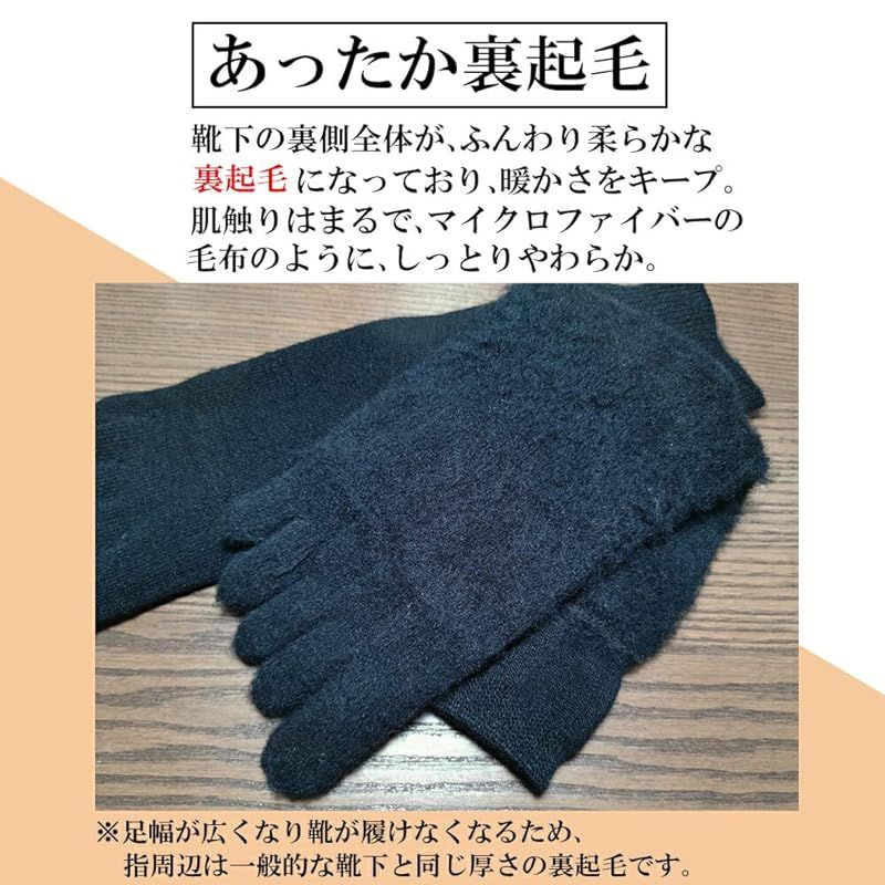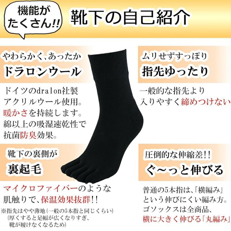 【商品概要】 靴下の裏側全体がふんわり柔らかな裏起毛になっており、暖かさをキープ。肌触りはまるでマイクロファイバーの毛布のように、しっとりやわらか。 ウールは捨てがたいけど、耐久度とお手入れの煩わしさが・・・という方に、ぜひおすすめしたい、ウール10%混&ドイツ ドラロン社の乾式アクリルの5本指ソックスです。特に発散力は綿にはない魅力ですので、冷え性・ムレには綿よりも効果的です。 3サイズで販売しております。23-25cm (小さいサイズ 23cm 24cm 25cm )/ 25-27cm (一般的なサイズ 25cm 26cm 27cm )/ 27-29cm (大きいサイズ 27cm 28cm 29cm ) 高伸縮糸と特殊技法(ハンドリンキング)により伸びやすく、フィットしやすい仕様になっています。ゴムサポートを入れることで、動いているときに靴下が回転にくく、靴を脱ぐ時に一緒に脱げにくくなっています。包み込まれる履き心地をぜひご体験ください。 自社工場で生産。原料:(一財)ボーケン品質評価機構の検査合格の原料使用(対洗濯性:JIS L 1930/洗濯(級):JIS L 0844/汗:JIS L 0848/摩擦:JIS L 0849)