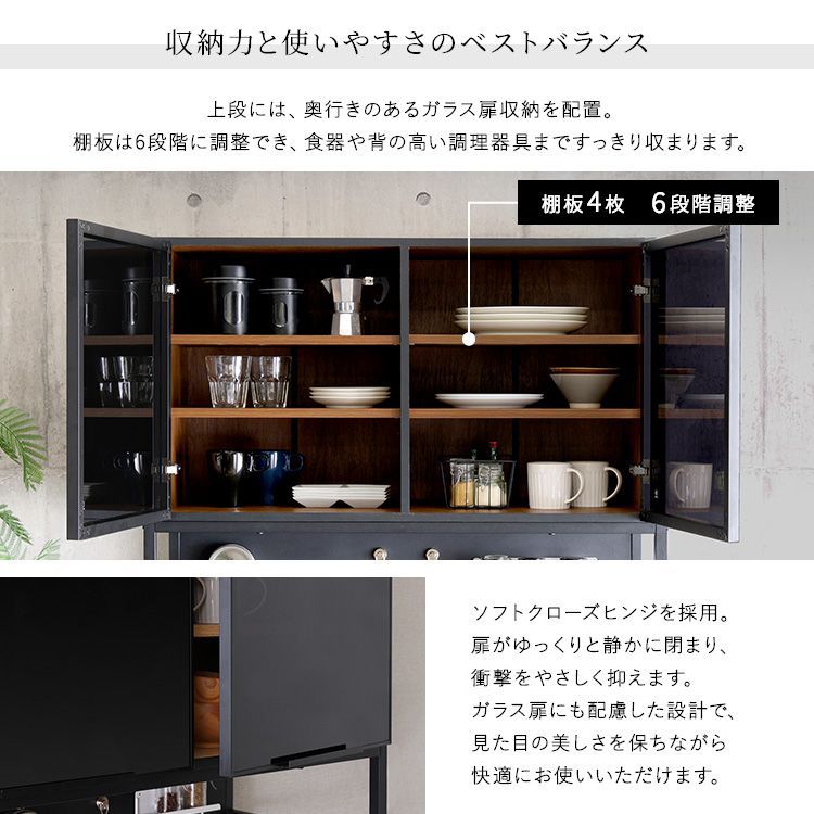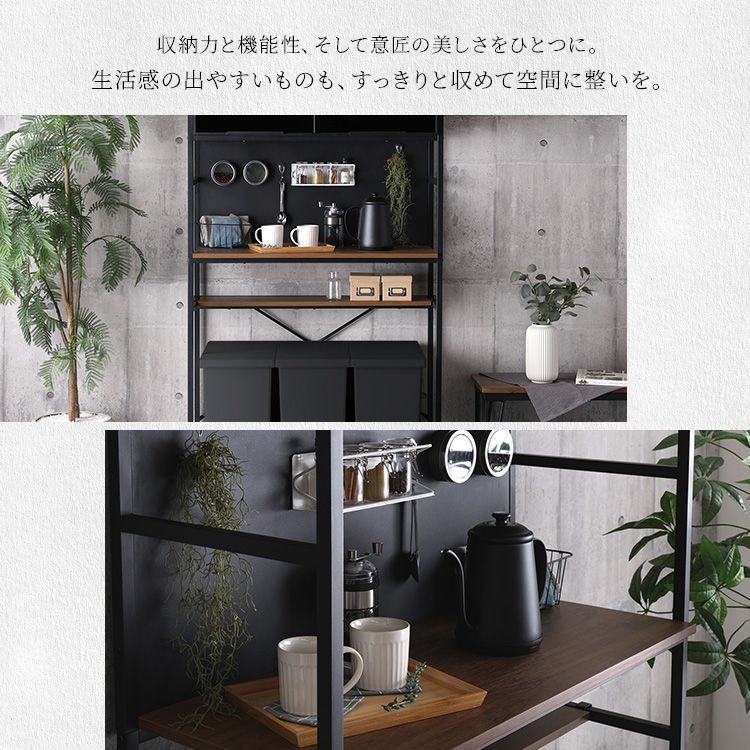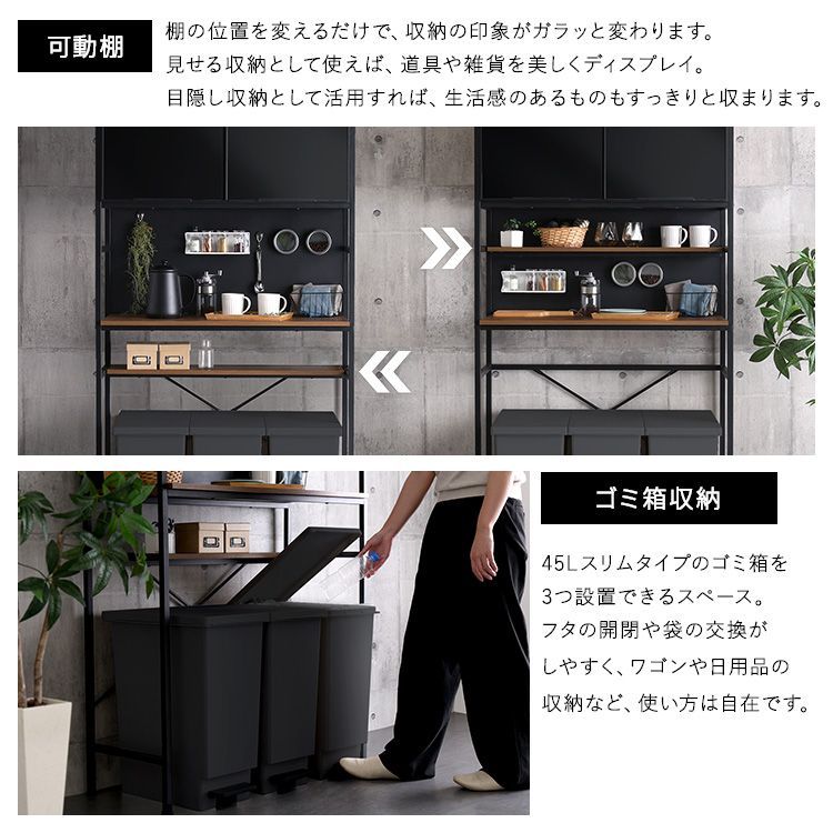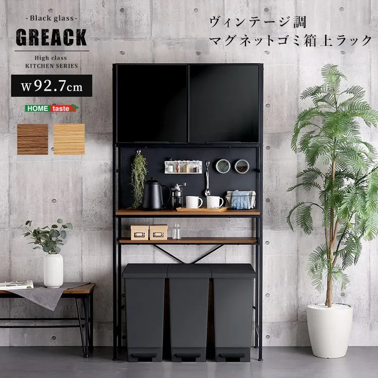 【商品説明】 ヴィンテージマグネットゴミ箱上レンジラック ブラックガラス! 45Lのゴミ箱が3つ置けるゴミ箱上ラック! 上段のガラス扉はブラックのスモークガラスなので高級感があります。 背板はマグネットになっているので、 市販のマグネット収納を取り付けてお好みでカスタマイズできます。 上段の収納扉にはソフトクローズのヒンジを採用しています。 可動棚が付いているので、オープン収納の上やゴミ箱収納の上に設置することができます。