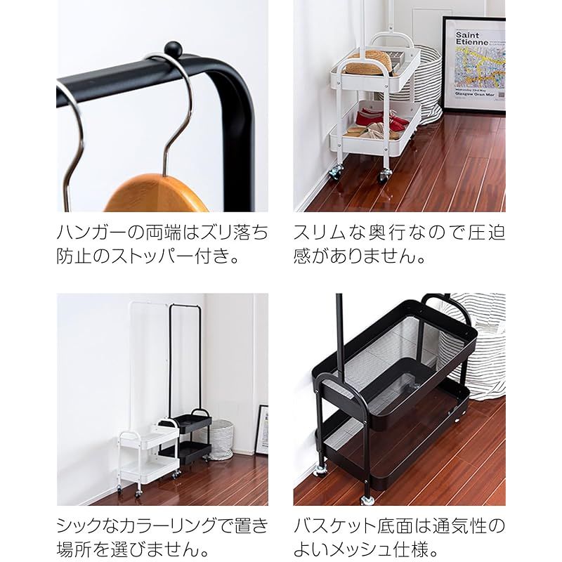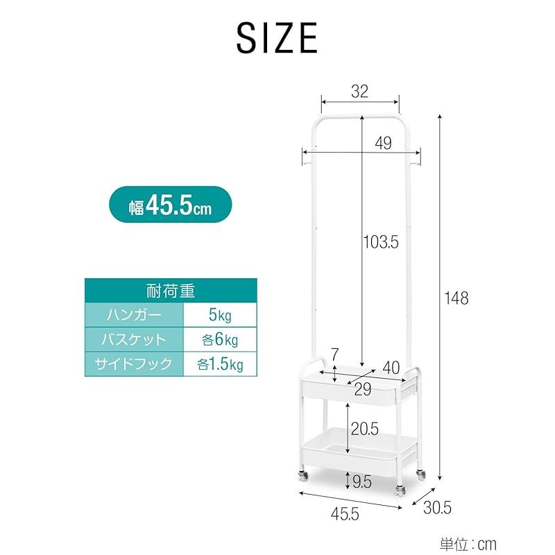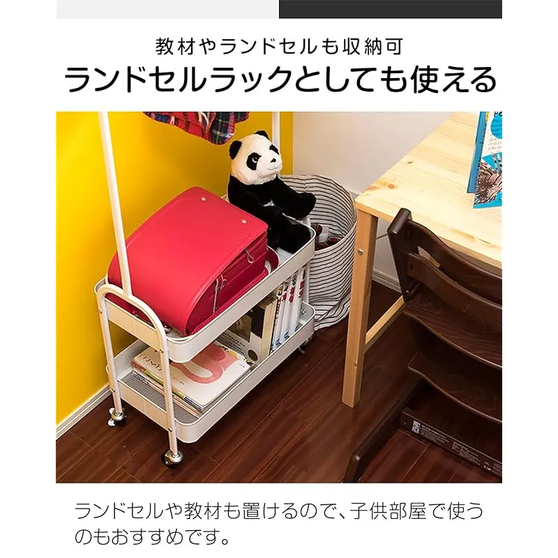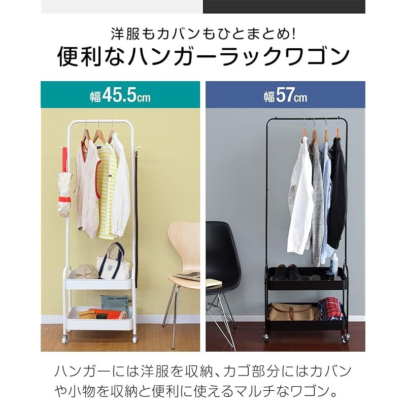 【商品説明】 洋服もカバンもひとまとめに! 便利なハンガーラックワゴン ハンガーラック部分には洋服を収納し、カゴ部分にはカバンや小物を収納し…と便利に使えるマルチなワゴン。軽量で様々な用途に使えます。 様々な用途で使える秘密 便利な2タイプの収納エリア 上部にはハンガーが掛けられるため、シャツやコートやストールなどの小物を「掛けて」収納できます。 下部は2段のラックが付属。カゴタイプの棚なので小物を畳んだり本など小物を収納することも可能。 幅45.5cmタイプにはさらにサイドフックも付いており、カバンなどを吊るしておくことができます。 教材やランドセルも収納可 ランドセルラックとしても使える! ランドセルや教材も置けるので、子供部屋で使うのもおすすめです。翌日の授業の準備がしやすく子供が自分で整理整頓する能力も身に付きます。 お掃除時など移動もしやすい スムーズに動かせるキャスター 重いものを乗せても楽々移動できるキャスター付きです。ストッパーが2カ所に付くので不意に動いてしまう心配もありません。