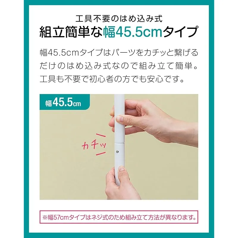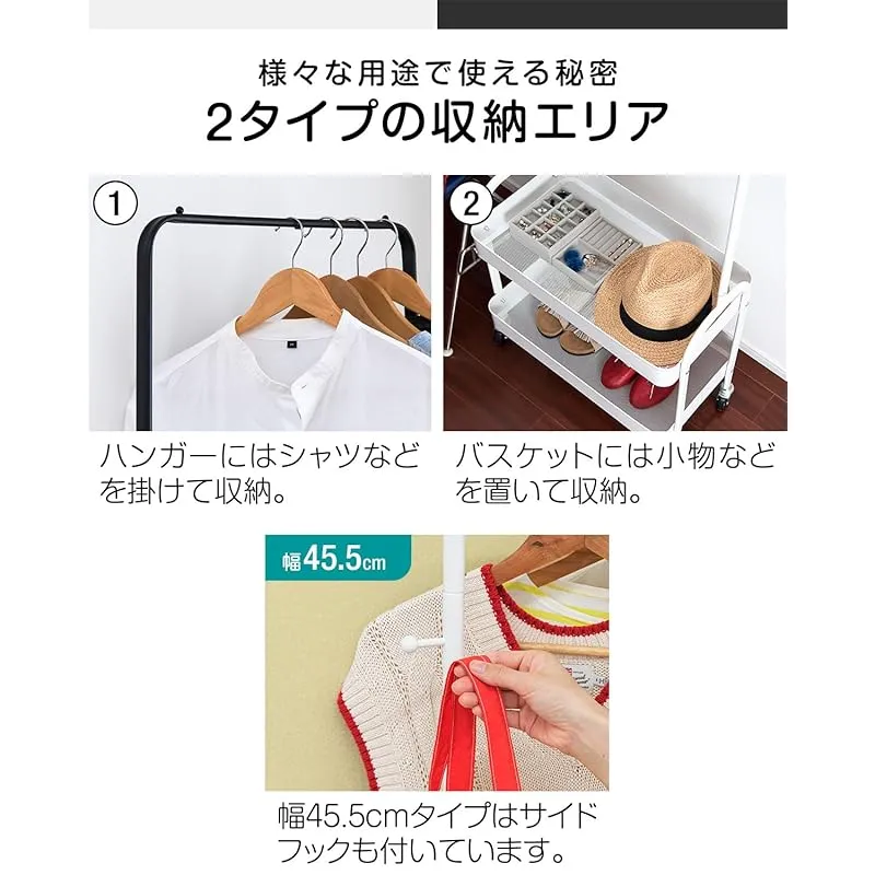 【様々な用途で使える秘密】便利な2タイプの収納エリア。上部にはハンガーが掛けられるため、シャツやコートやストールなどの小物を「掛けて」収納できます。下部は2段のラックが付属。カゴタイプの棚なので小物を畳んだり本など小物を収納することも可能。 幅45.5cmタイプにはさらにサイドフックも付いており、カバンなどを吊るしておくことができます。 ?