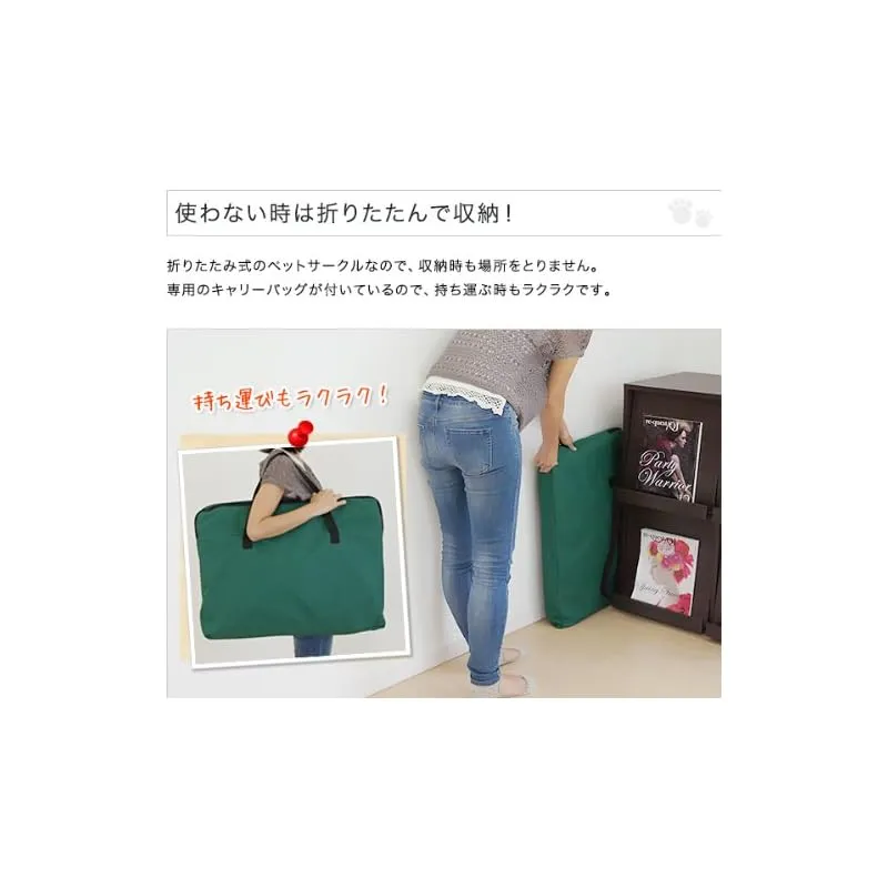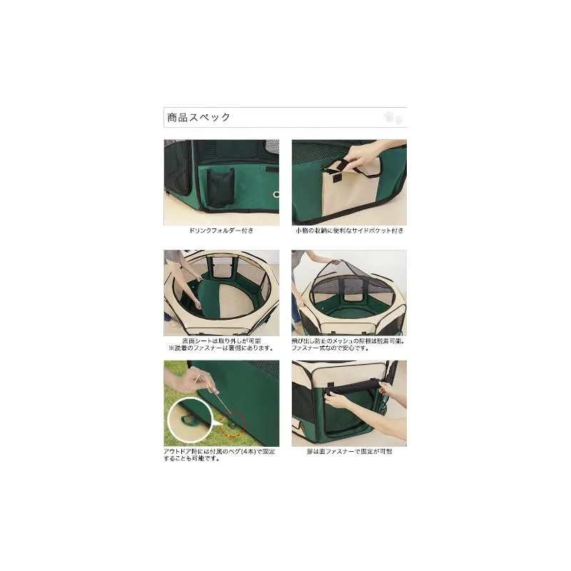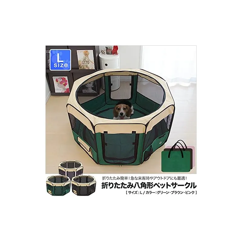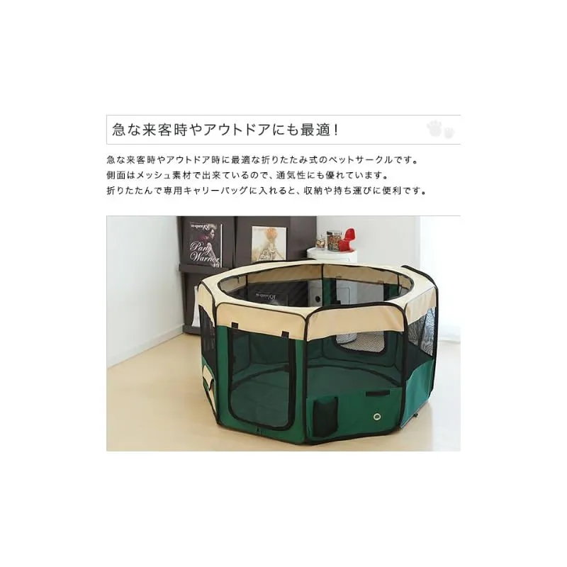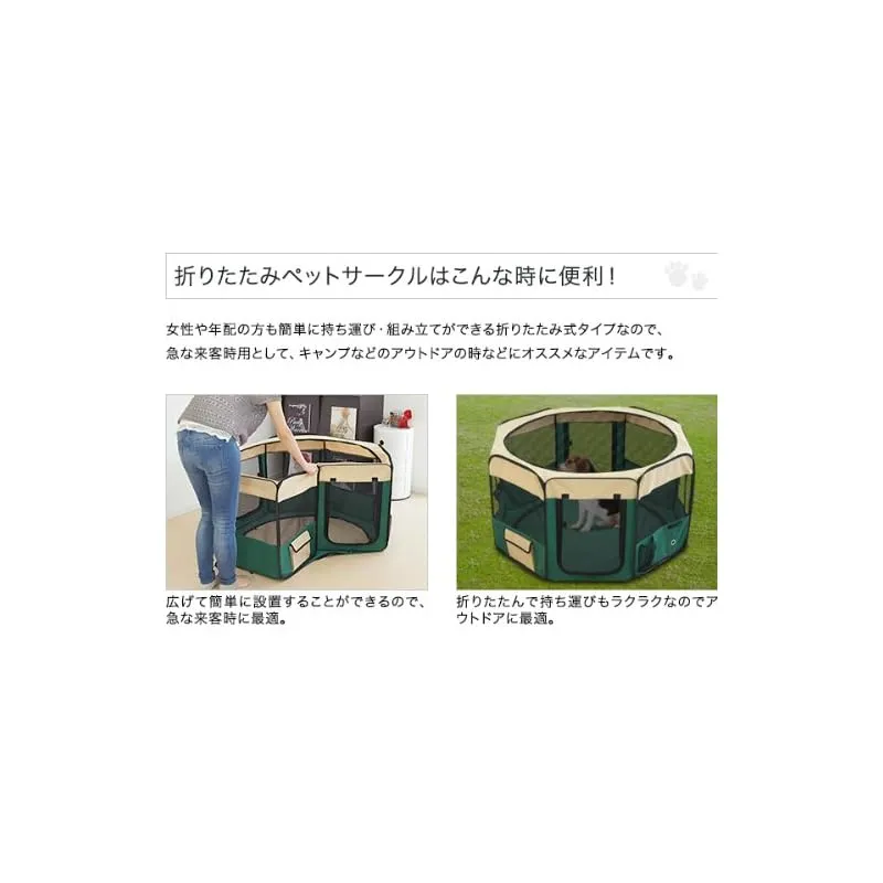 【商品概要】 color:ピンク size:Lサイズ: サイズ 組み立て時:(約)114cm×62cm 収納時:(約)67cm×50cm 重量:(約)2.5Kg 材質:ポリエステル/スチール 参考サイズ:柴犬、ビーグル等 ※参考サイズはあくまで目安です。 ※キャリーバッグと本体内側には、材質を強化する為にPVC(ポリ塩化ビニル)加工が施されています。 PVC加工は素材同士の摩擦や折れ目によって生地が白化する場合がございます。 こちらは傷ではありませんので、予めご了承ください。 ※商品は、モニターによって色合いが異なって見える場合があります。 ※仕様・デザインは改良のため予告なく変更することがあります。 color:グリーン size:Mサイズ: サイズ 組み立て時:(約)90cm×62cm 収納時:(約)67cm×40cm 重量:(約)2.0Kg 材質:ポリエステル/スチール 参考サイズ:トイプードル、ミニチュアダックス等 ※参考サイズはあくまで目安です。 ※キャリーバッグと本体内側には、材質を強化する為にPVC(ポリ塩化ビニル)加工が施されています。 PVC加工は素材同士の摩擦や折れ目によって生地が白化する場合がございます。 こちらは傷ではありませんので、予めご了承ください。 ※商品は、モニターによって色合いが異なって見える場合があります。 ※仕様・デザインは改良のため予告なく変更することがあります。
