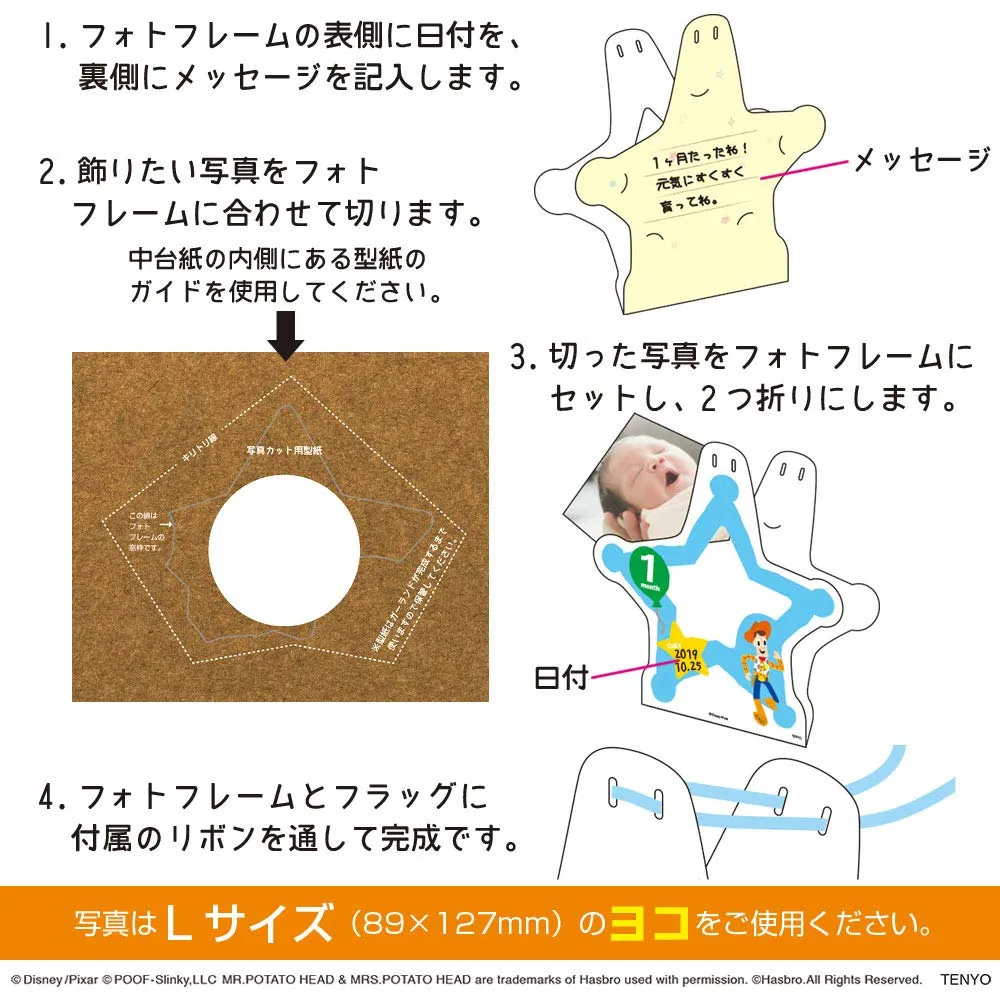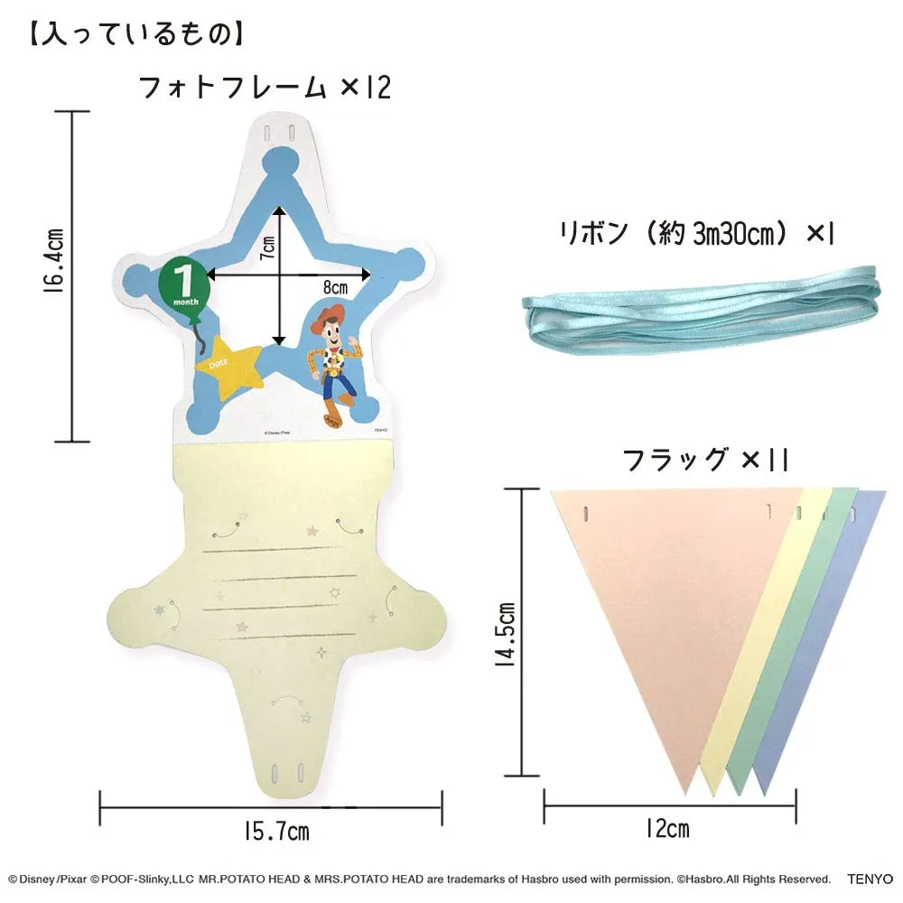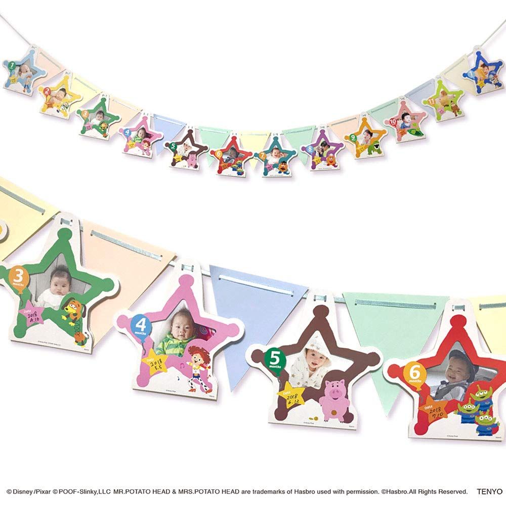 生まれてから1か月ごとに1歳までの写真を入れて、付属のリボンに旗と一緒に通せばオリジナルのガーランドが作れます。