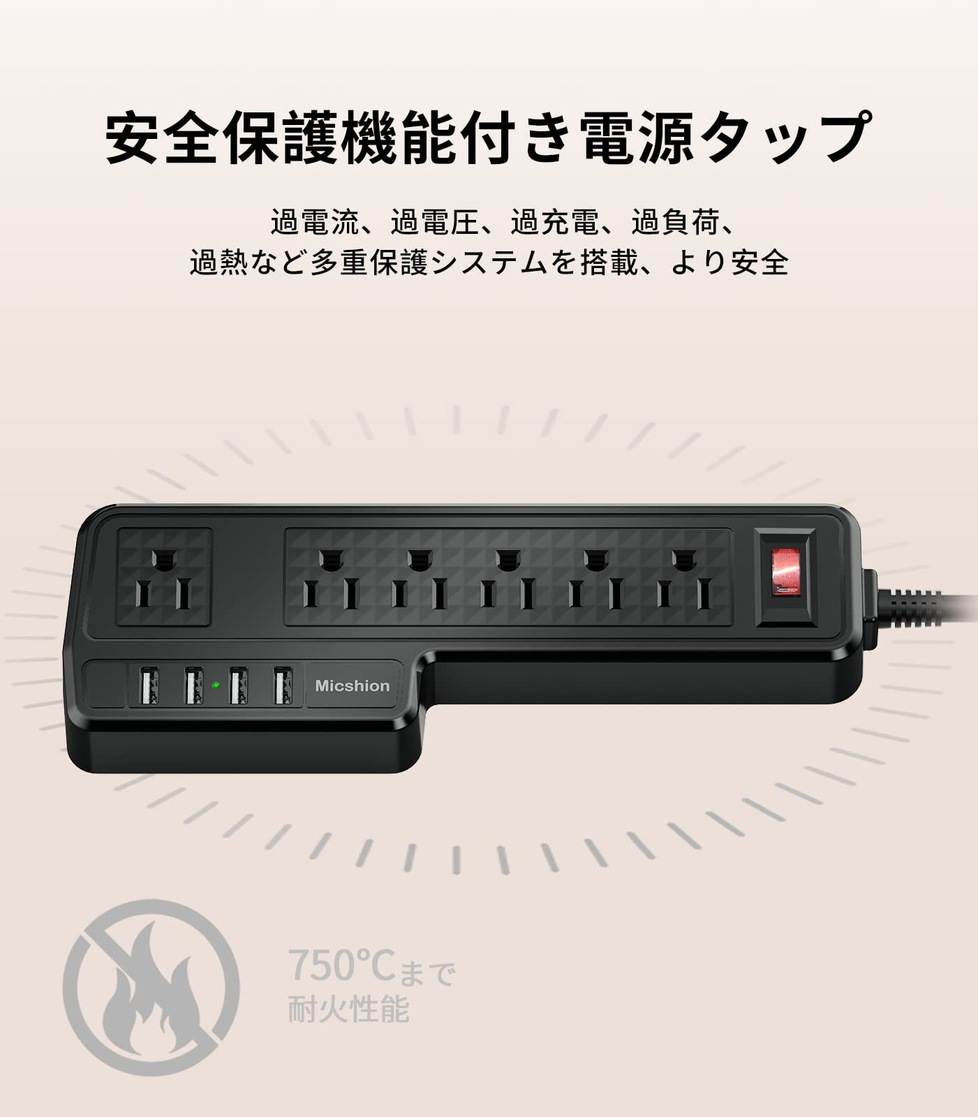 【迅速発送】Micshion USB電源タップ コンセント 個別スイッチ 6AC充電口(110-240V)+4USBポート(3.4A/5V)壁取付用固定フック 急速充電可能 雷ガード 過負荷保護 2m延長コード オフィス/家庭給電用 (ブラック)