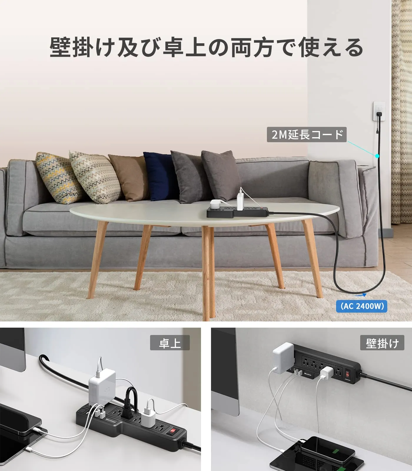 Micshion USB電源タップ コンセント 個別スイッチ 6AC充電口(110-240V)+4USBポート(3.4A/5V)壁取付用固定フック 急速充電可能 雷ガード 過負荷保護 2m延長コード オフィス/家庭給電用 (ブラック)