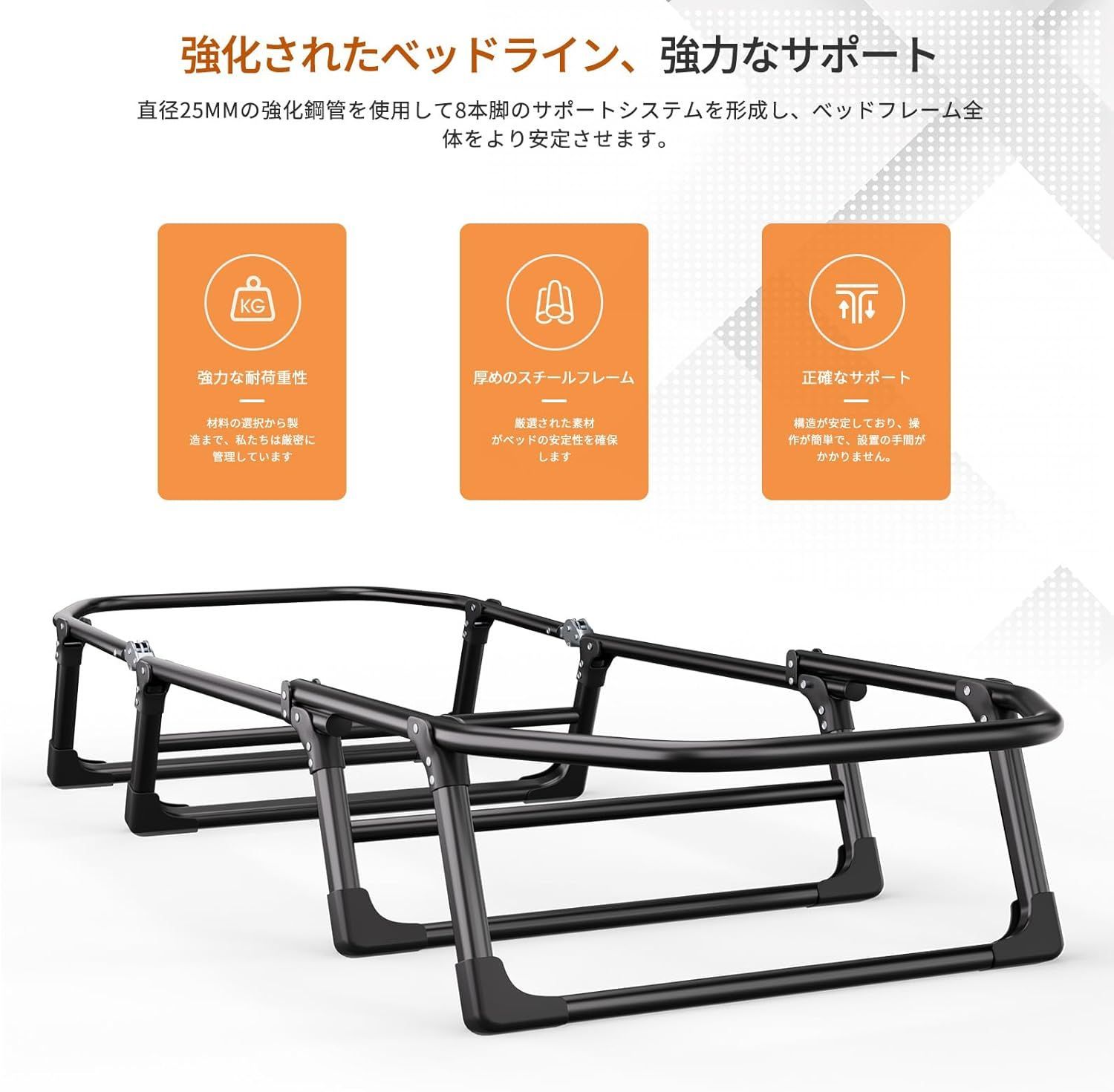 【高耐久性&超安定感】25mm 極太スチールフレーム+8 脚構造を採用し、耐荷重 100kg を実現。簡易ベッドながら安定性と安全性を両立し、滑り止め付き脚でどの場所でもしっかりと支えます。防錆加工を施しており、長期間の使用にも安心です。