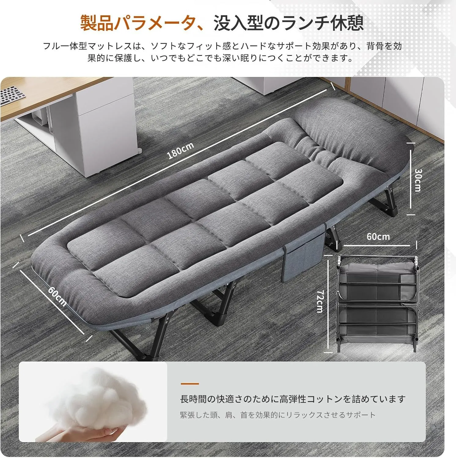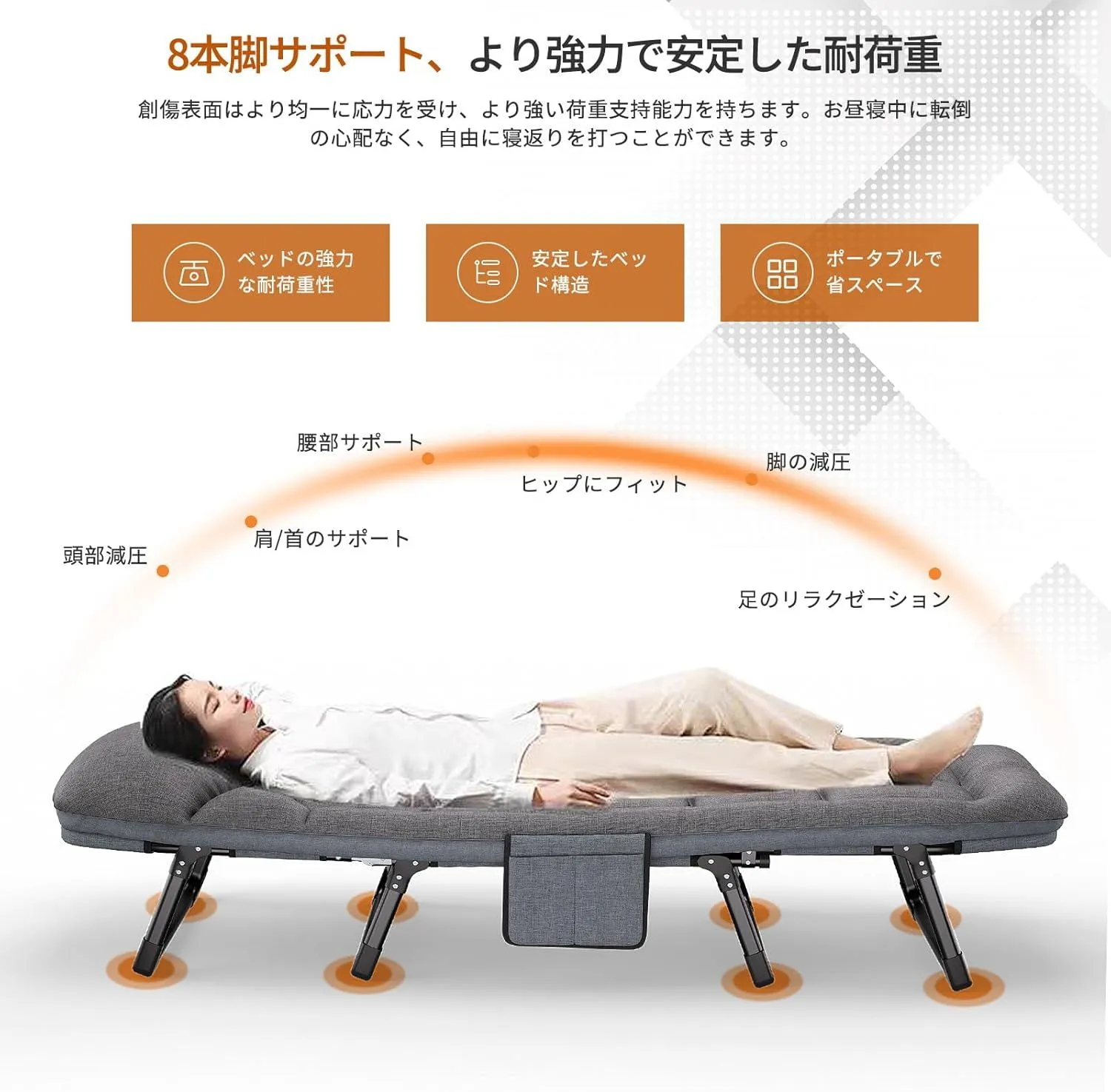 【多シーン活躍|幅広く活用可能】アウトドアではキャンプ、釣り、花見はもちろん、災害時の緊急ベッドとしても信頼できます。室内では来客用、仮眠用、車中泊、病院の付き添い用など、多様なシーンで活躍します。軽量で折りたたみ式のため、収納場所を選ばず、持ち運びも簡単です。