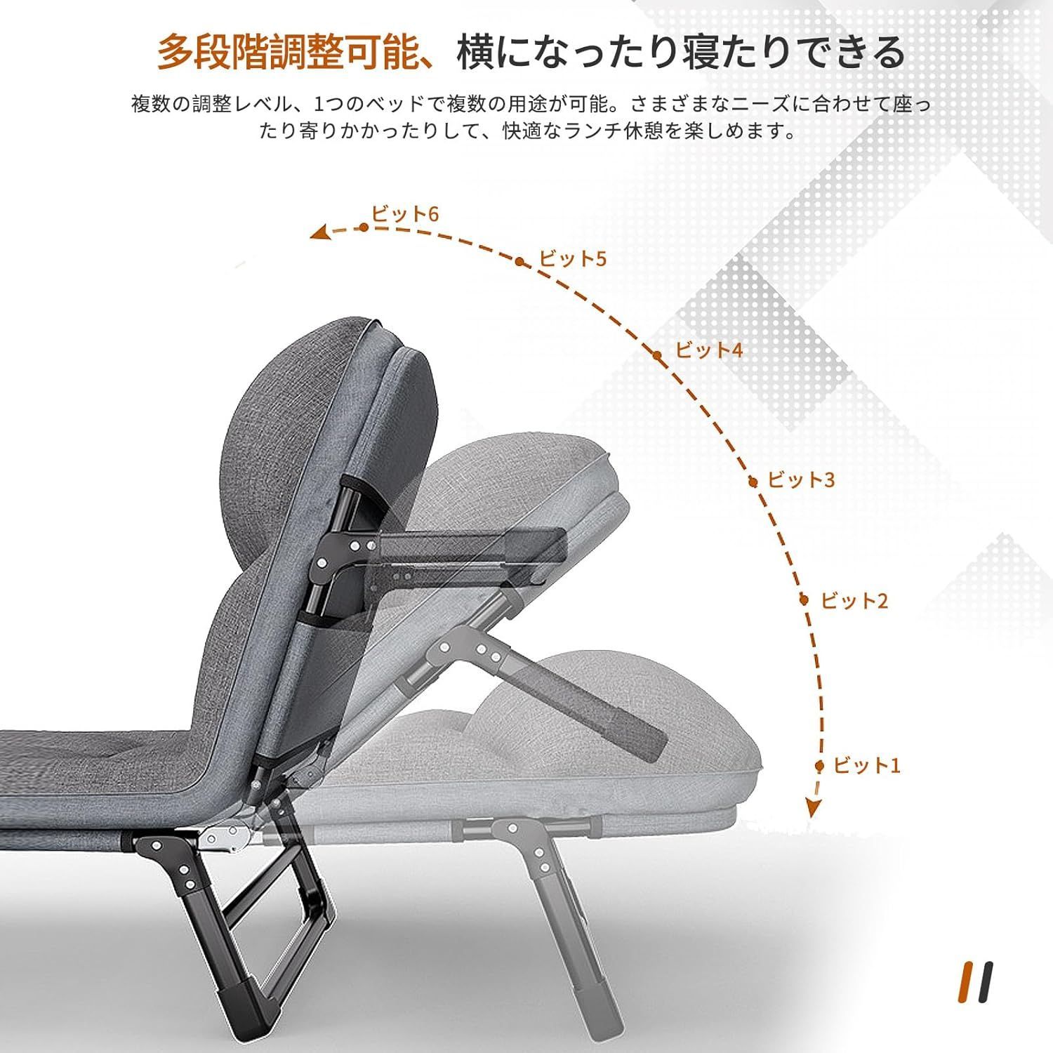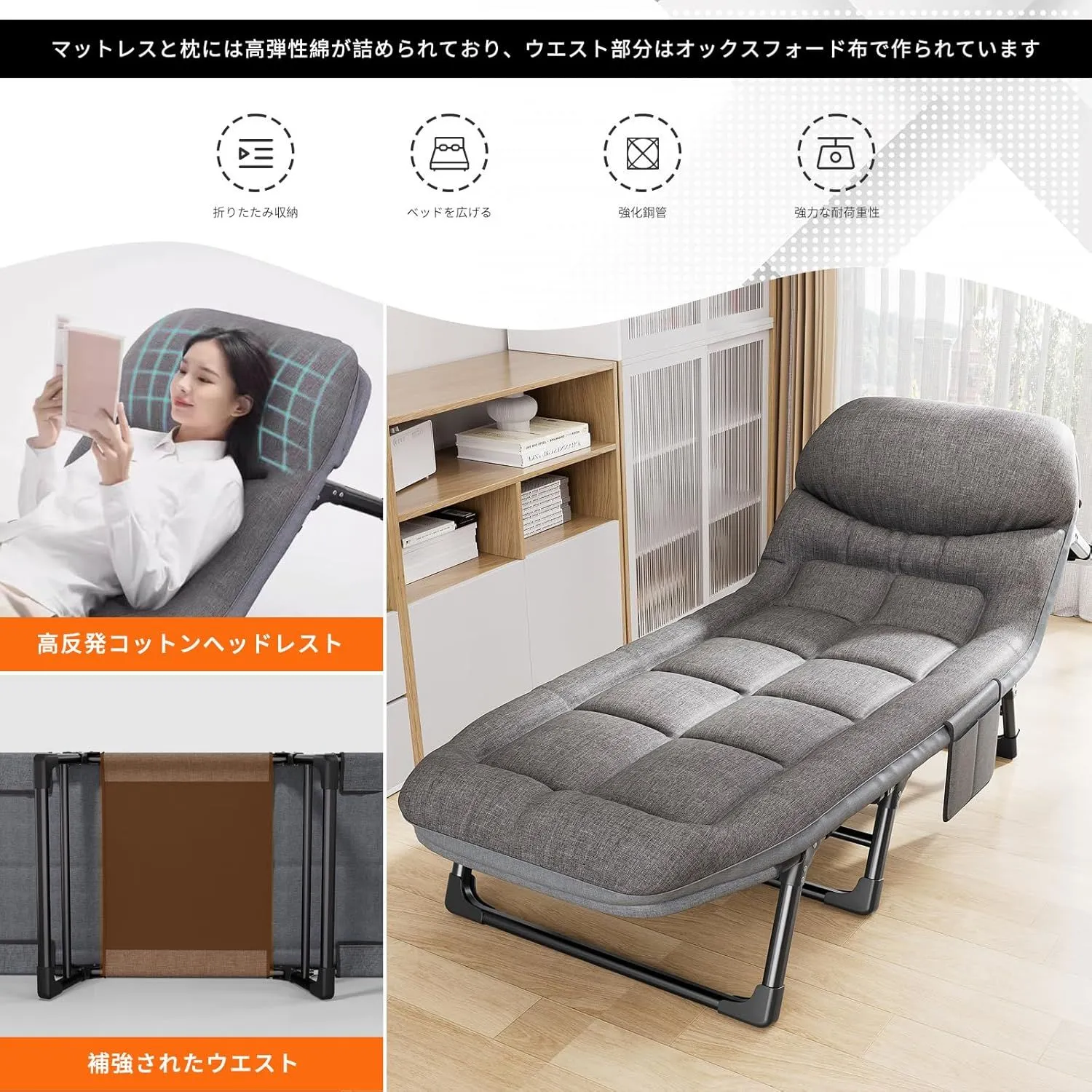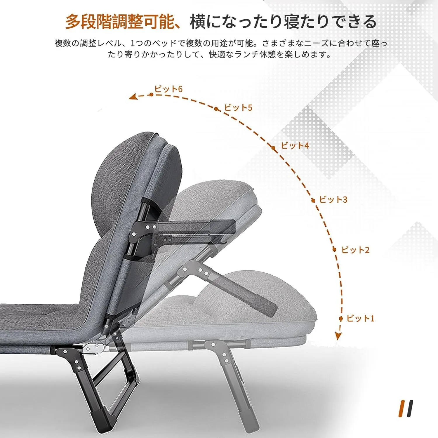 【6 段階リクライニング|多機能自在】6 段階リクライニング機能を搭載し、ベッドからリクライニングチェアまで瞬時に切り替え可能。読書、テレビ視聴、昼寝など、用途に合わせて最適な姿勢を自由に調整でき、折りたたみベッドの柔軟性を最大限に発揮します。