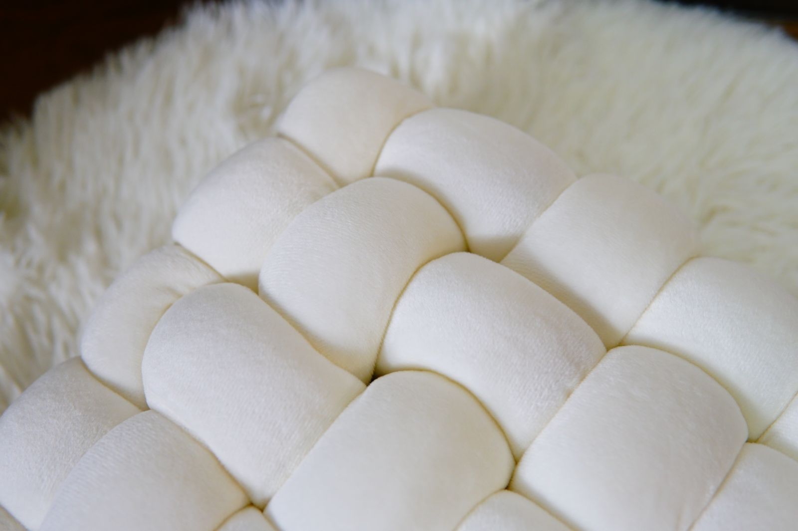 手触りの良い滑らかなベロア調の生地を編み込んだ、立体的でユニークなデザインが特徴。 置くだけでお部屋の素敵なアクセントになり、流行の韓国インテリアや北欧テイスト、モダンなお部屋作りにもぴったりです。