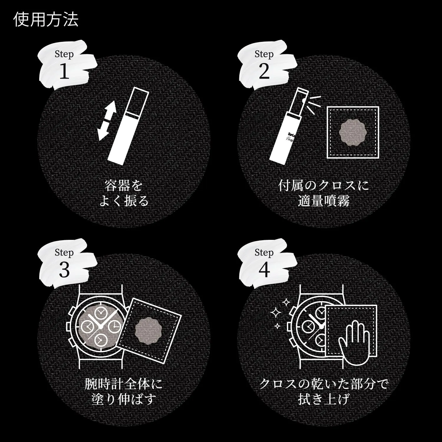 ガラス系特殊ハイブリッドコート配合。コーティング被膜を形成し、腕時計を保護し汚れをつきにくくします。