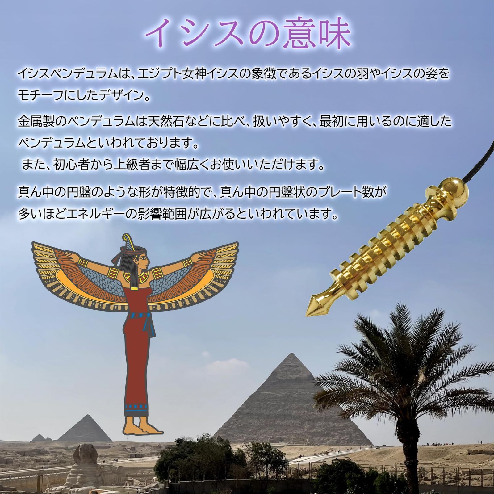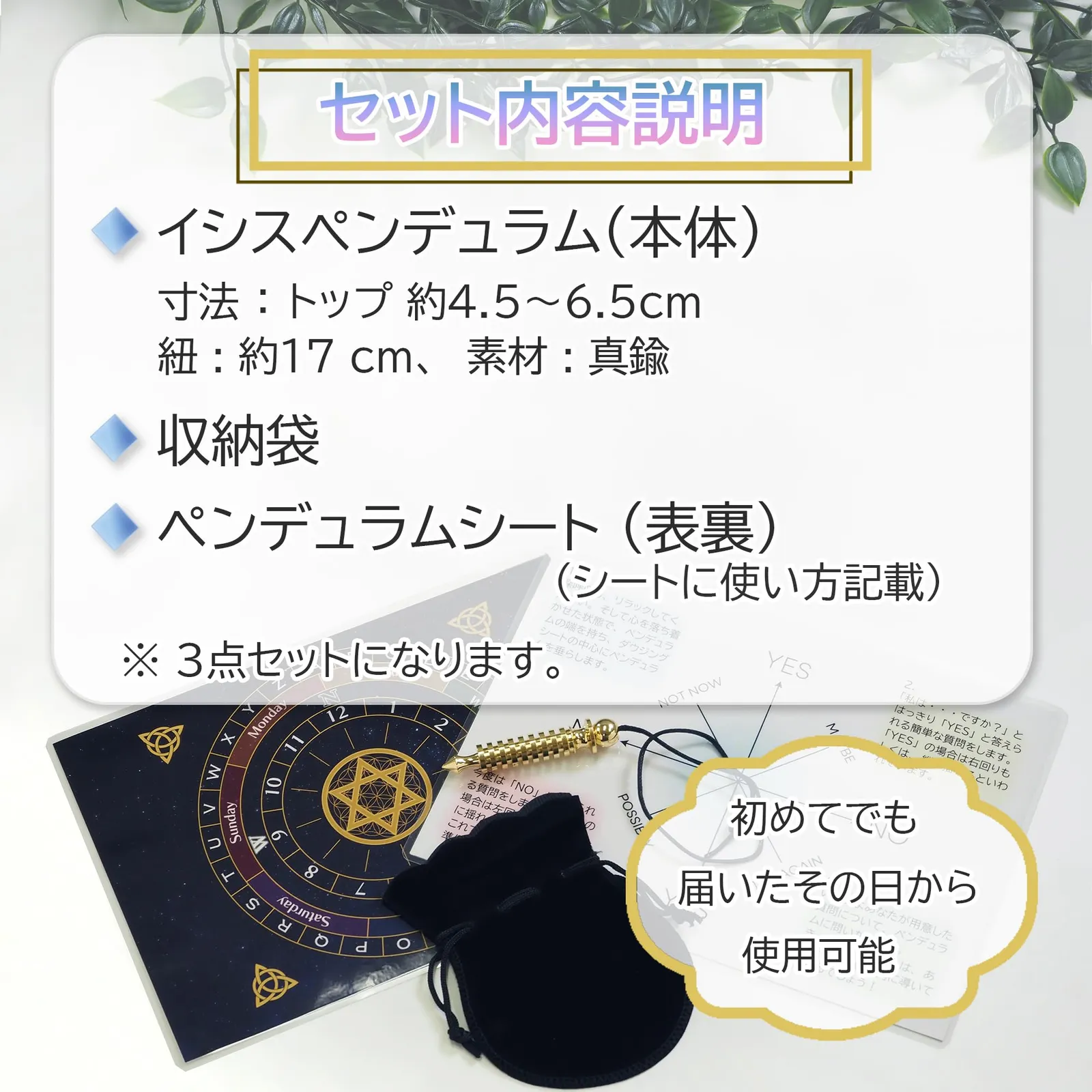【3点セットの特徴】本体のペンデュラムはイシスの象徴であるイシスの羽根やイシスの姿をモチーフとしたデザイン。ペンデュラムチャートは両面使え、説明が記載されています。ですので商品が届いてすぐに使えますので初心者の方にもおすすめです。収納袋はペンデュラムが入る大きさで持ち運びに大変便利になっております。 ?