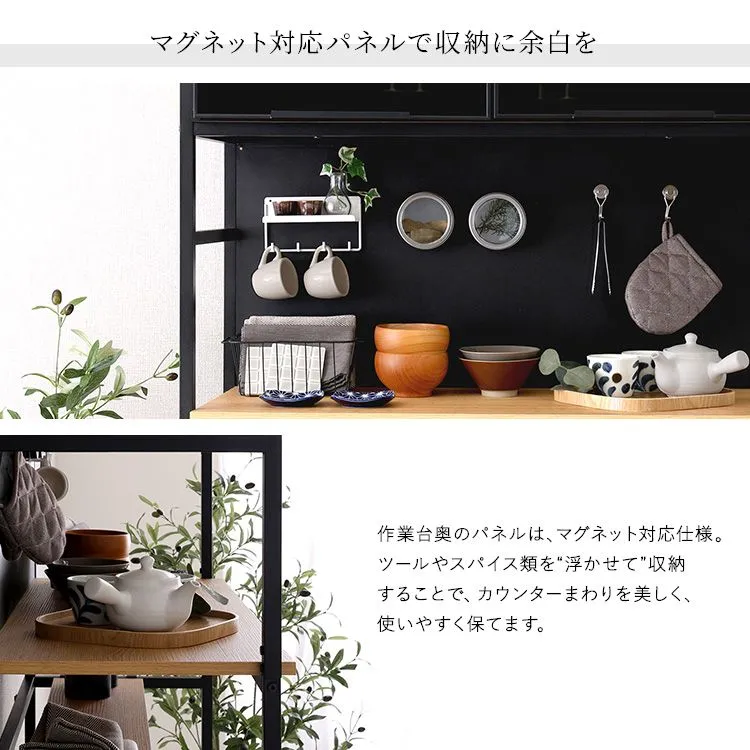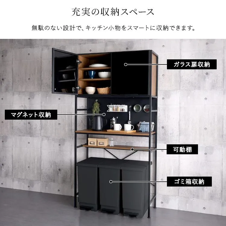 【商品説明】 ヴィンテージマグネットゴミ箱上レンジラック ブラックガラス! 45Lのゴミ箱が3つ置けるゴミ箱上ラック! 上段のガラス扉はブラックのスモークガラスなので高級感があります。 背板はマグネットになっているので、 市販のマグネット収納を取り付けてお好みでカスタマイズできます。 上段の収納扉にはソフトクローズのヒンジを採用しています。 可動棚が付いているので、オープン収納の上やゴミ箱収納の上に設置することができます。