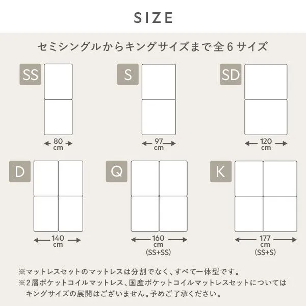 ■サイズ(約) セミシングル:幅80×長さ195×高さ23cm シングル:幅97×長さ195×高さ23cm セミダブル:幅120×長さ195×高さ23cm ダブル:幅140×長さ195×高さ23cm クイーン:幅160×長さ195×高さ23cm