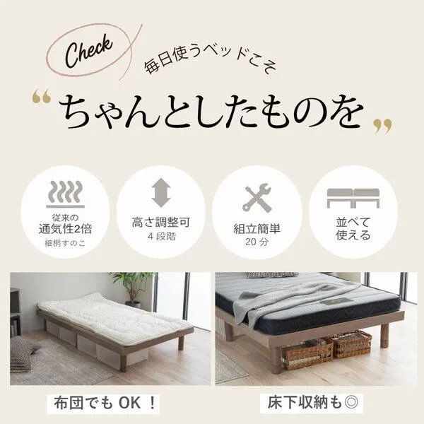 ■商品内容 一般的なスノコよりも細く密にならんだ桐材がポイント。通常の2倍の通気性。高さ調節4段階可能。置き場所を選ばないシンプルなヘッドレスデザインです。