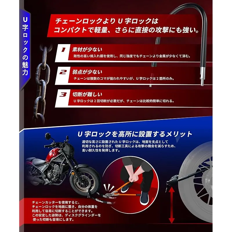 【U字ロックの特長】 Sサイズ1000g、Lサイズ1300gと軽量。チェーンロックは自由度があり地球ロックがでいる反面、接合部分があり鎖状に連結している為、厚みを持たせると材料が増し、重くなりやすい欠点があります。U字ロックは接合部分が無く、軽量で厚みを持たせやすい利点があります。チェーンロックに比べて自由度はありませんが、破壊に対して強い特徴があります。