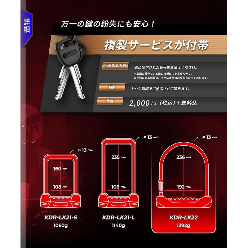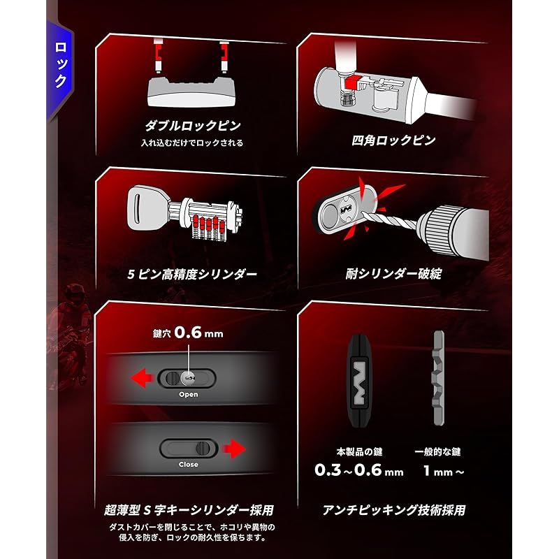 【高品質シリンダー】 純銅製のシリンダーを採用し、精密加工により耐久性を強化。屋外で使用するバイク用のカギはロックが解錠できなくなるトラブルが一定数発生します。解錠トラブルを軽減するため、高品質なシリンダーを採用しています。一見キーは一般的なピンタンブラー錠に見えますが、超極薄0.6mmの鍵穴とS字形状などのアンチピッキング技術が採用されています。キーナンバーをお控え頂き、ご要望があれば1~2週間で複製しお届けする別途サービスを行っております。※屋外で使用する場合は、鍵穴用の潤滑剤を使用するなど、定期的なメンテナンスを行うことで、製品をより長く快適にお使いいただけます。