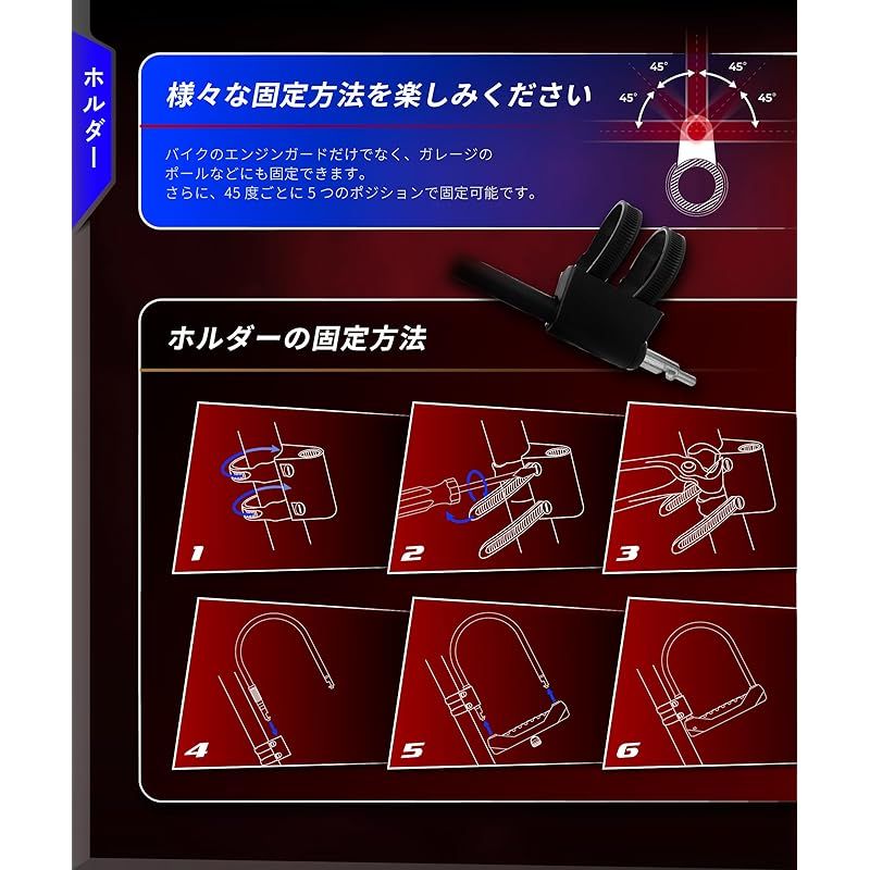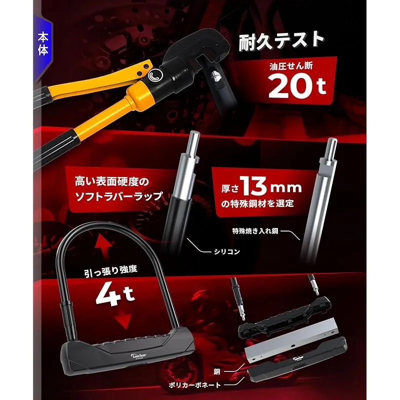 【特殊焼き入れ鋼】 特殊鋼合金を使用し、特殊な焼き入れ処理を施したU字ロックは、20トンの油圧せん断に耐える高い硬度を持っています。厚さ13mmのスチール鋼を採用し、無音の油圧カッターによる攻撃に対抗可能です。焼き入れ処理による表面硬度が、せん断耐性をさらに強化します。また、防犯性能を高めるためにアンチドリルプレートを装備。これにより、ドリル攻撃への耐性も備えています。また引っ張り強度4トンを誇る角型ロックピンを採用しています。U字ロックが引き抜かれるといった攻撃に対して優れた耐性を発揮します。