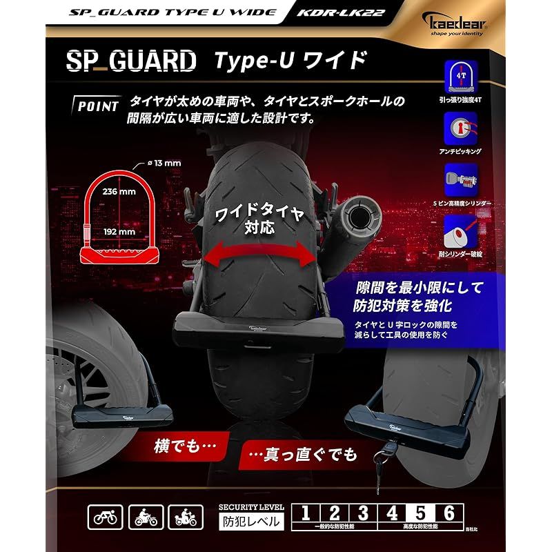【SP_GUARD Type-U ワイド】 縦236mm、幅192mmのU字ロックは、タイヤ幅が太い車種やタイヤとスポークホールの間に距離がある車種に最適です。一般的にタイヤ幅190までに対応する車種が多い中、大型バイクのようなタイヤ幅200を超える車種でも、横からロックすることが可能です。※ご使用の際は、タイヤとスポークホールの距離が192mm以内であることをご確認ください。